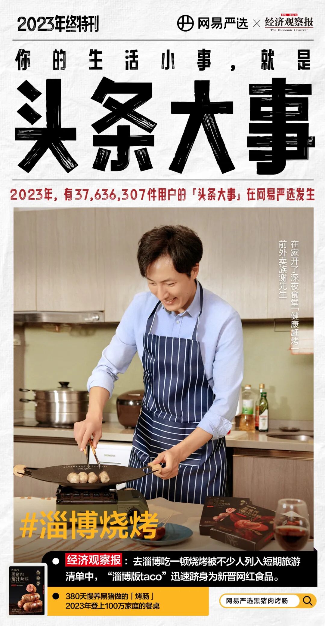 2023年,八方旅客“进淄赶烤”,一顿烧烤带火一座城;前外卖族谢先生在家“健康赶烤”,一个人带火朋友圈。一串串喷香的网易严选黑猪肉烤肠,是老谢朋友圈每晚定时的深夜放毒。