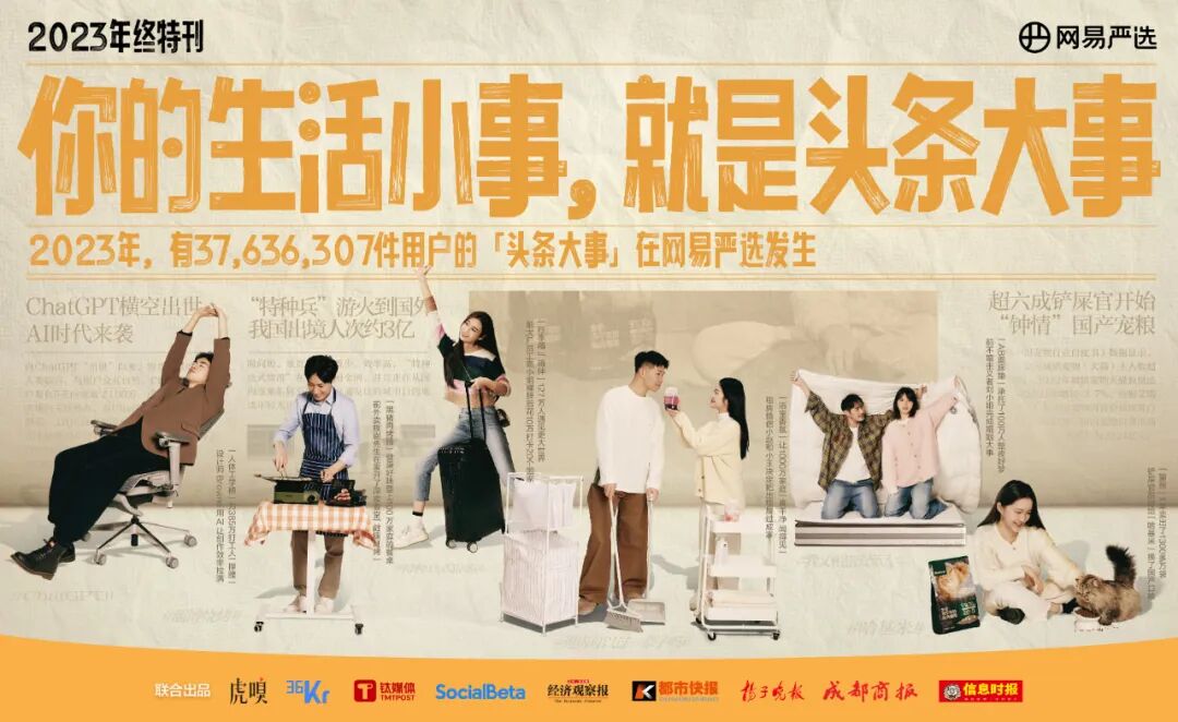 作为年轻一代喜爱的生活方式品牌,网易严选敏锐地捕捉到了这些变化,将2023年热点趋势的“宏观”和六位普通用户生活小事的“微观”做了巧妙结合,并联合虎嗅、钛媒体、36Kr、Socialbeta、经济观察报、都市快报、扬子晚报、成都商报、信息时报等9家主流媒体将这些生活小事搬上了头版头条。以“你的生活小事,就是头条大事”为主题,让用户故事与新闻大事串联,为2023年画上温馨的句点。