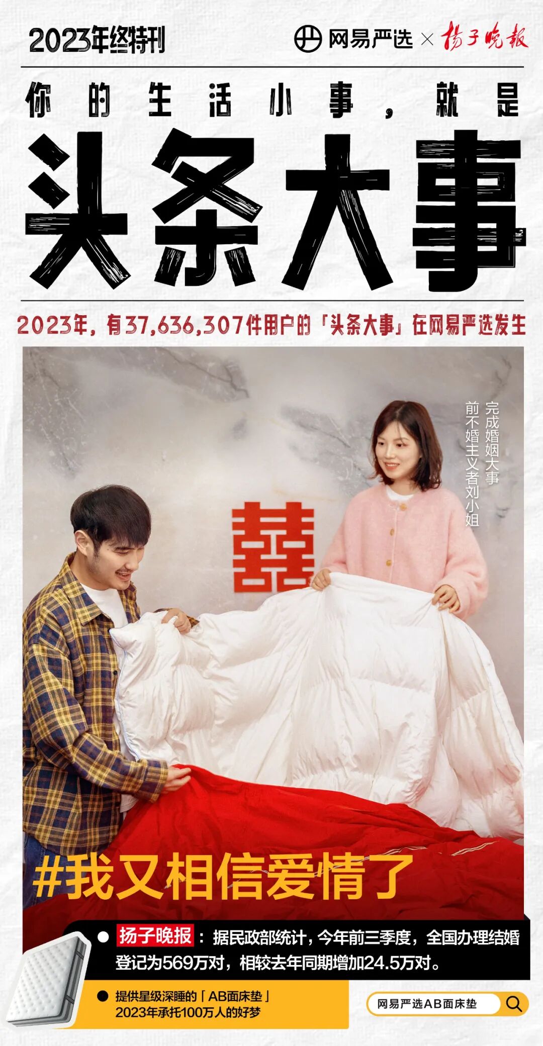 2023年,有37,636,307件用户的「头条大事」在严选发生。对网易严选而言,用户身边的「生活小事」就是「头条大事」,这映射了网易和用户在一起的价值观。