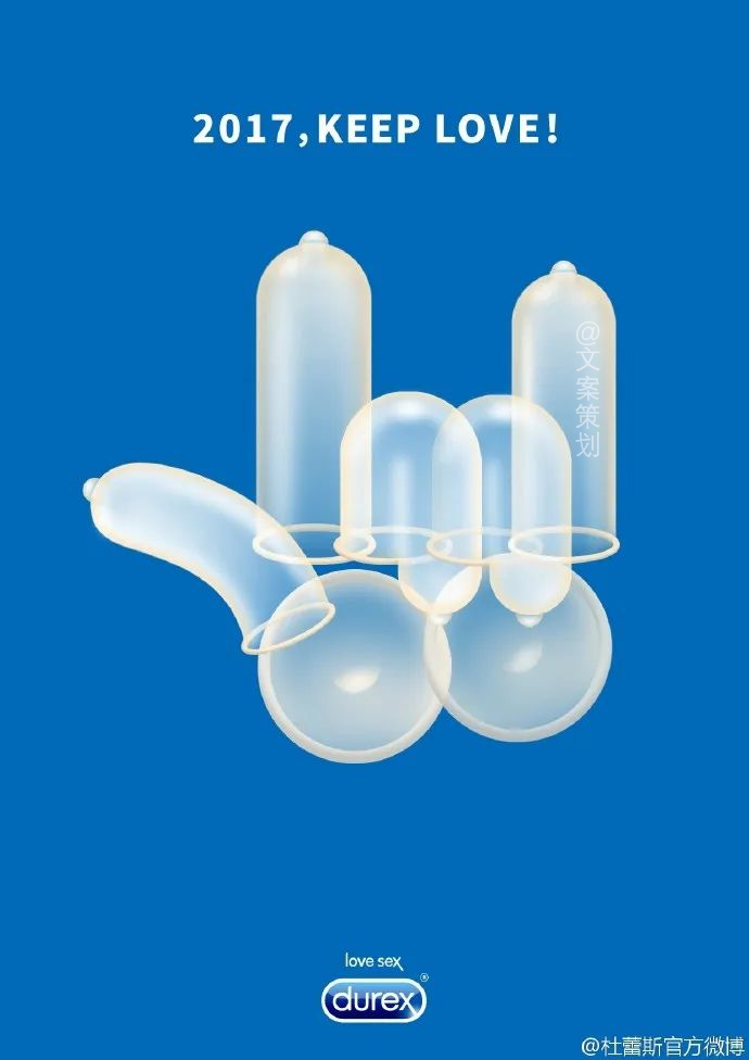 杜蕾斯的借势营销,通常在海报的创意表现形式上,要远远高于其文案。在这组元旦借势海报中,杜蕾斯就将产品组合成了不同的形状。
