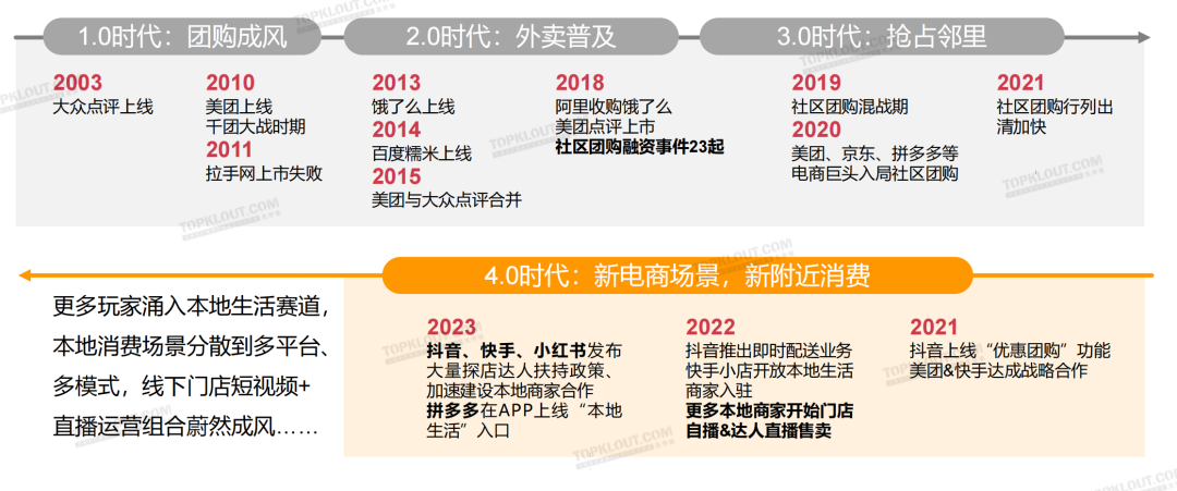 根据克劳锐《品牌社交营销系列研究——本地生活篇》显示,本地生活业务的发展已经步入4.0阶段,“新电商场景”、“新附近消费”成为了当下阶段的主要特征。本地消费场景分散到多平台、多模式,线下门店短视频+直播运营的组合逐渐成为新的风潮。