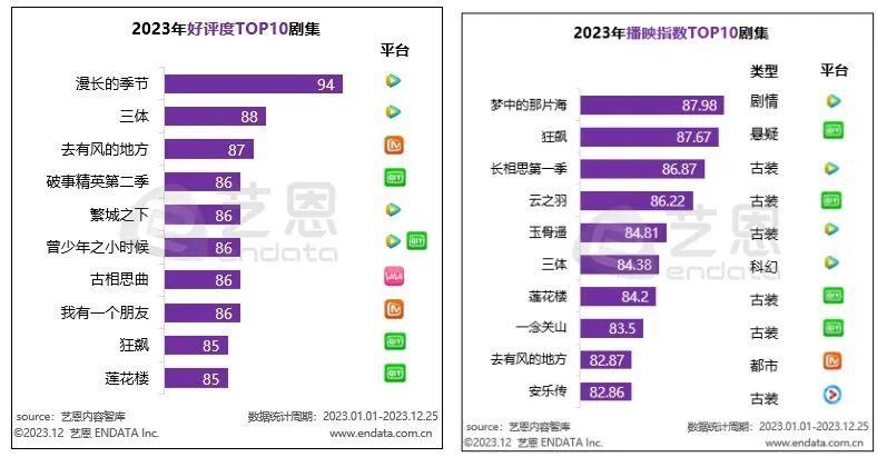 平台在尊重创作者的同时也收获了内容的正回馈。如艺恩数据显示,2023年播映指数Top10和好评度Top10中,腾讯视频各占四席,《漫长的季节》更是以9.4的豆瓣评分成为剧集年度口碑冠军。