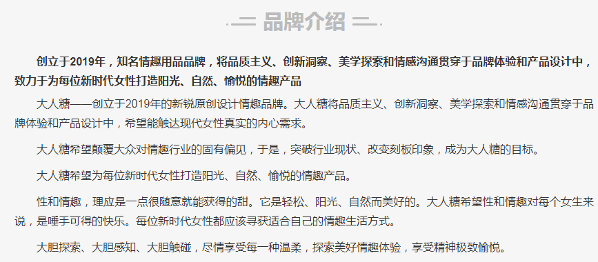 据iiMedia Research(艾媒咨询)数据显示,中国情趣用品的市场规模一直保持稳定上升的态势,预计2025年市场规模达2081.3亿元。情趣用品行业在生产环节上已经趋于成熟,市场增长率逐渐稳定。目前全世界70%的情趣用品都产自中国。大人糖的联合创始人张致玮,曾就职于卫生巾品牌「轻生活」与知名安全套品牌「冈本」,这两段职场经历让他在情趣赛道上,拥有了比一般人更敏锐的市场洞察力。在创业之前,张致玮查看了 2017 年 4 月-2018 年 4 月淘内情趣行业的数据,增长很快。他判断随着时代发展,未来大家对情趣用品的接纳度会越来越高,这意味着大盘还会往上走。仅创立一年,大人糖就成为行业内首个天猫销售额突破千万的品牌,长期位列天猫成人玩具类目Top1,年营收达2亿元。2021年就完成了 2.5 亿元人民币 的A 轮融资。除了线上成绩亮眼,作为首个将门店开进商业地产的情趣品牌,大人糖的门店店员透露“基本每天的流水都有几万元”,对于大人糖来说,线下门店的作用不仅仅局限于反哺线上GMV,而是一个可以独立运行的商业模型。线下门店为消费者提供了一种实体的、面对面的交互体验,使得消费者可以更直观地了解产品、亲自试用,以及与品牌建立更紧密的联系。这种体验在某些方面是线上渠道无法替代的。