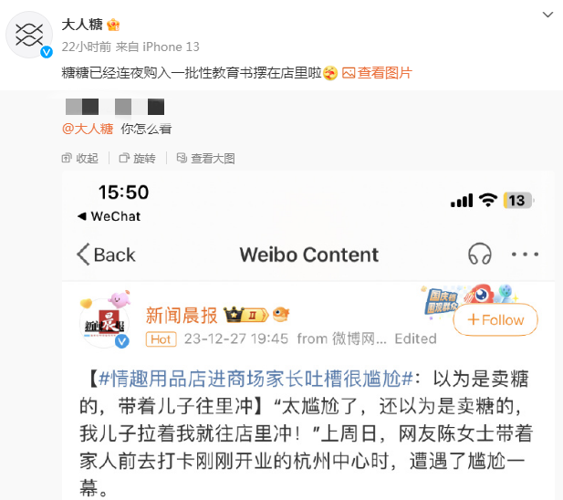 有媒体前往门店采访,店员则表示:“门头和店内的标语都明确写了仅限成人,未成年人是不允许进入店内的,我们也会有店员在门口提醒。之前有抱着婴儿的女士想进店,我们也劝退了。”而对于#情趣用品店进商场家长吐槽很尴尬#这个话题,大人糖官方微博也转发网友微博并回应,已经在店里面摆上关于性教育的书籍,名称为《做不尴尬的父母》。