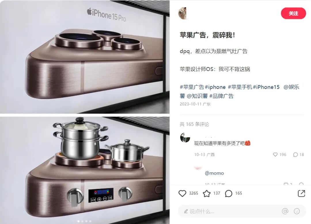 比如,苹果的iPhone 15 Pro手机海报,虽然能理解它是想突出产品的镜头效果好和使用了“钛金属”的材质,但手机这摆放的方式,放大的比例,怎么看怎么像是燃气灶。