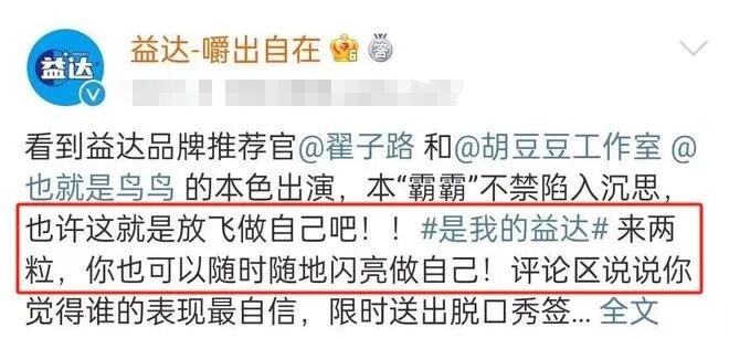 不过没关系,益达自己解释了,原来是想表达来两粒益达,“放飞做自己”的广告主题。