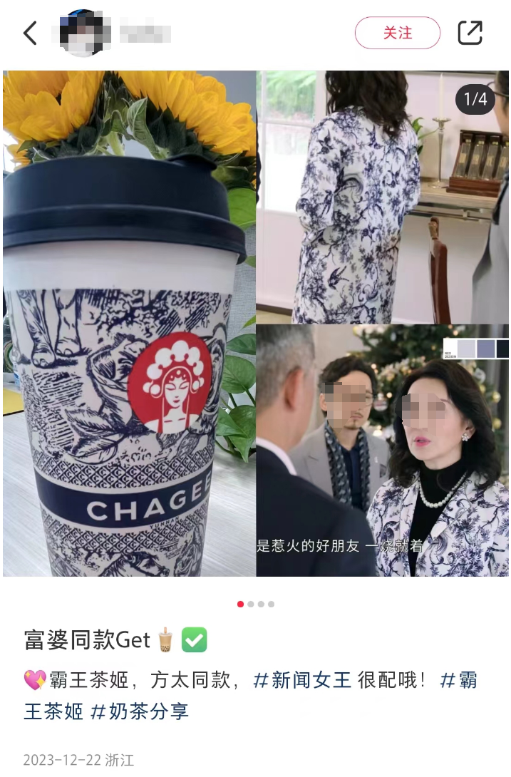 方太穿搭和霸王茶姬外包装撞衫,被网友调侃“披着奶茶外壳”,不知道的还以为霸王茶姬和《新闻女王》做联名,这可比砸钱做植入还香。
