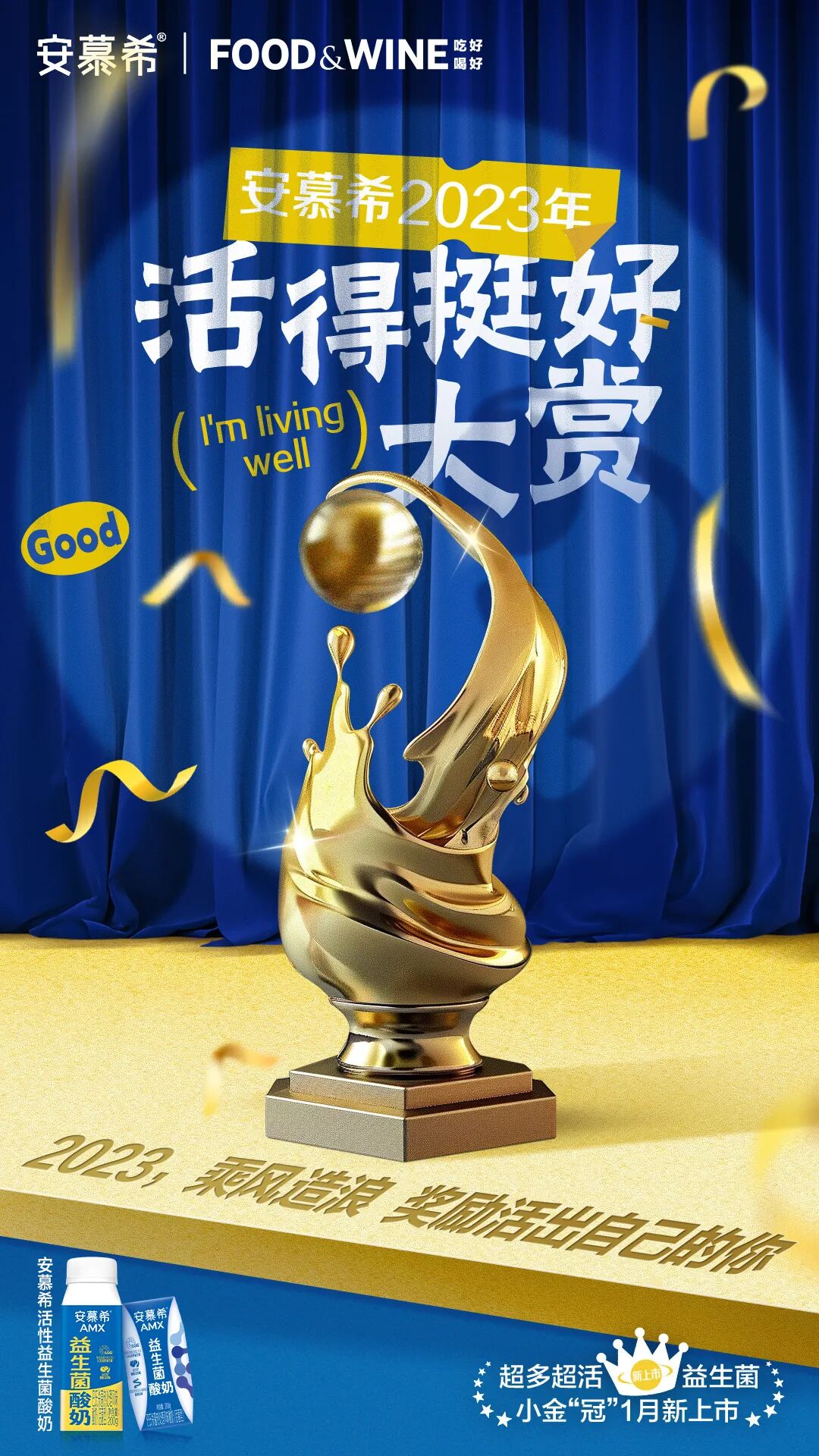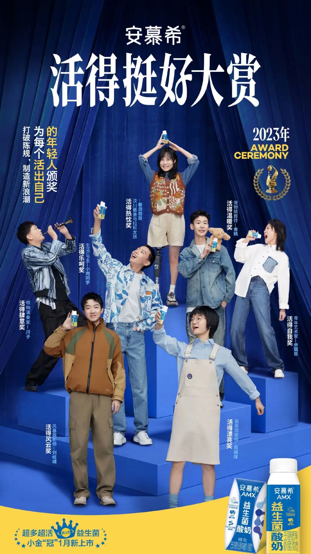 安慕希在新品小金“冠”2024年1月初上市之际,借助“活得挺好大赏”趣味性的奖项设计和群像式的人物展示,为年轻人呈现千人千面的新故事,以活力满满的益生菌酸奶支持每一个年轻人活出自己,活得漂亮,展现了产品功能和品牌精神的双向沟通,由此带来了一场与众不同的年末社会话题营销。