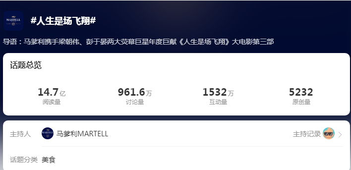 马爹利(Martell)是产自法国干邑地区的著名干邑白兰地品牌,也是世界上最古老、最驰名的白兰地酒。如今,“马爹利”已经成为名贵好酒代名词,驰名全世界。和不断突破自己的梁朝伟和彭于晏一样,创立于1715年的马爹利,不断超越巅峰,追求更高的传奇。1912年,爱德华·马爹利突破桎梏,创造了马爹利蓝带这款彰显非凡勇气的干邑。这款干邑极富创意地打破了当时只结合分级和酒庄名来命名的规则。历经三个多世纪的传承与沉淀,又调和了续写马爹利传奇的XXO。短片最后梁朝伟将XXO这瓶酒递给彭于晏,不仅是说酒不错,更暗示着三金影帝梁朝伟将这种突破的精神传承给彭于晏。中青两代巨星的碰撞,看点十足,通过两位在中国市场有着巨大影响力的品牌代言人,进一步加快马爹利与本地文化的融合,获得更多本地消费者认可。在微博上,该短片目前已获得708 万播放量,相关话题 #人生是场飞翔# 累计拥有 14.7 亿阅读量,实现了声量爆破。不仅拍摄品牌大片,马爹利在上海举行了《人生是场飞翔》第三部大电影全球首映暨《金手指》点映会,梁朝伟还现身与现场来宾互动抽奖,分享这部电影台前幕后的趣事和独家花絮,进一步将这部短片热度推上了高峰。梁朝伟精湛的演技不仅赢得了现场观众的一致好评,他敬业的精神以及不断突破自我的态度,更进一步诠释了马爹利的品质匠心精神。