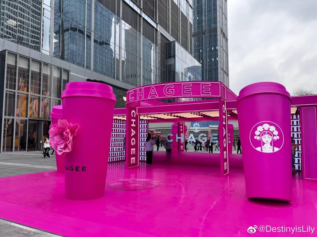 霸王茶姬预热樱花乌龙系列时,换上粉色logo、上线#霸王茶姬粉了#,还在成都炸街开快闪,营造樱花的次元空间:整了个巨型樱花和巨型奶茶杯,掀起一场粉色风暴。