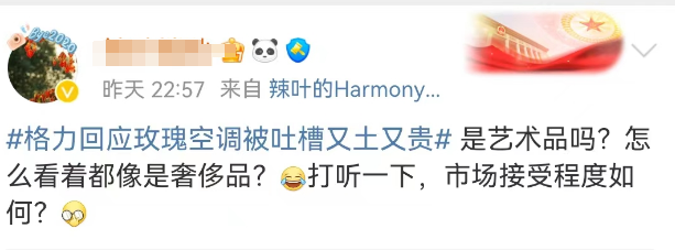 格力回应如何看待又贵又丑时,恨不得堆满高级词汇往空调上贴金:“予人玫瑰手有余香,送给用户的艺术品,展示‘让世界爱上中国造’的美好愿景。”