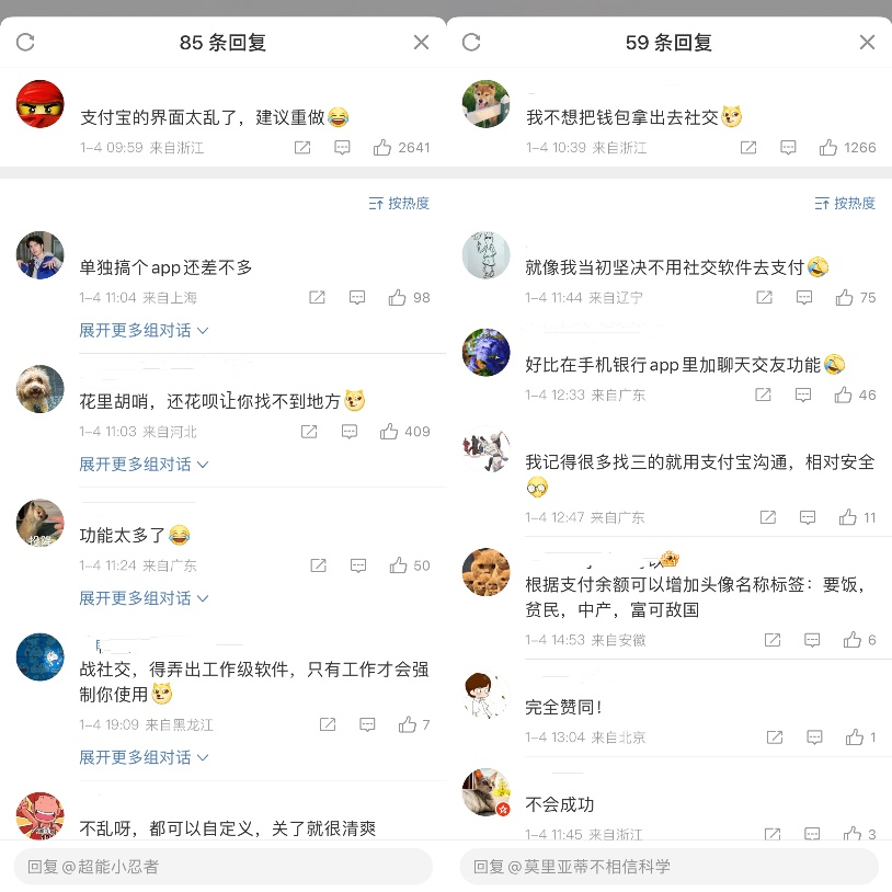 但支付宝的兴趣社交则与之不同,在没有了游戏与公益的功能性之后,兴趣社交的目的变得更加直接,那么用户在使用这一功能时就会考量更多。一来,支付宝的用户究竟有多少兴趣社交的需求?二来,即便是有兴趣社交需求的用户,为什么会选择在支付宝这一支付工具上实现这一需求?
