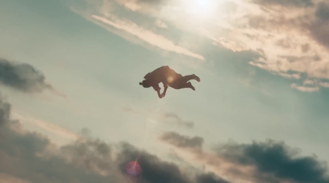 现实空间中随之地动山摇,主角也开始浮空,而此刻脑洞的一幕出现,男主人公直接冲破层层墙壁,跃上天际,在到达天空最高点时垂直下坠,从超市下坠到地铁......