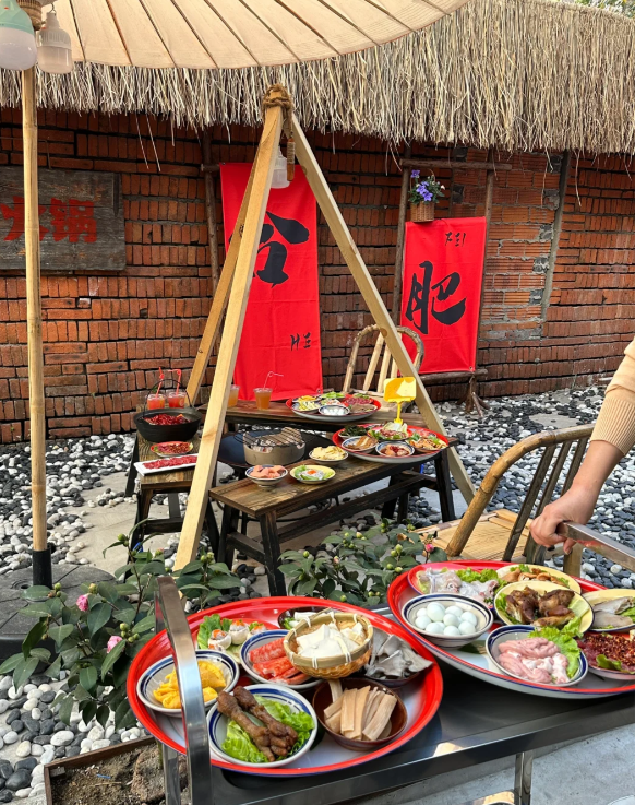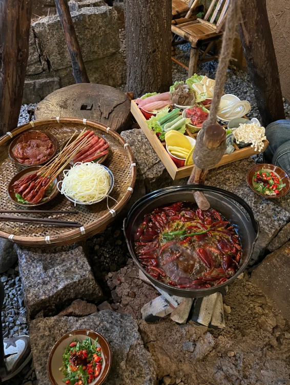 而进阶版的就完全不同了,商家会用石块围搭成火塘的形式,锅也实实在在地用麻绳吊了起来,一般用原木搭建成三角支撑架。食材也是放在一旁的砖块上,主打一个自由,像是在野外一样的随性。