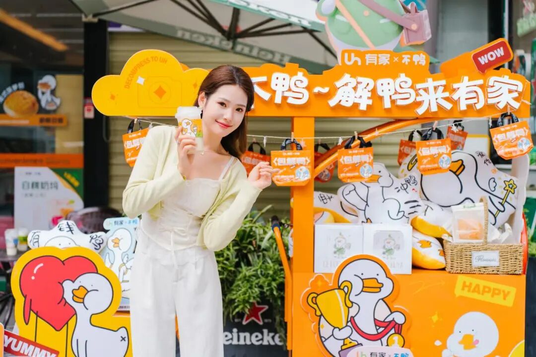 比如2023年联合表情包IP不鸭合作,推出《不鸭!解鸭来有家》主题联名,将不鸭元素和奶茶进行深度结合,打造【甄选鲜萃奶茶】联名产品——大红袍奶茶、茉莉奶绿等,借助谐音梗选建立“超解鸭”的产品功能联想,化身年轻人嘴替展现“不加班、升职加薪”等具象化视觉元素,其所传达出来的态度,也是打工人所想要表达的情绪;同时在四店落地快闪车巡游,营造沉浸式的线下体验空间,为年轻人提供网红打卡点,满足他们社交分享的情感需求。