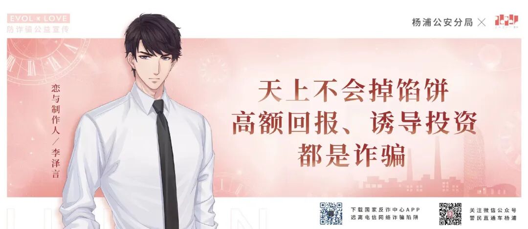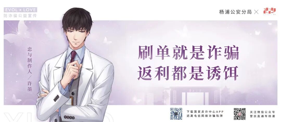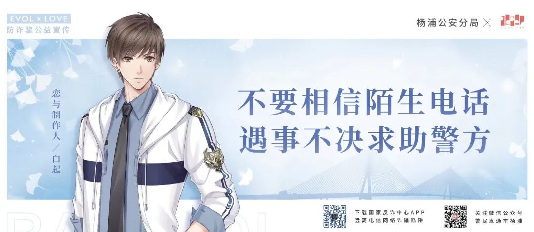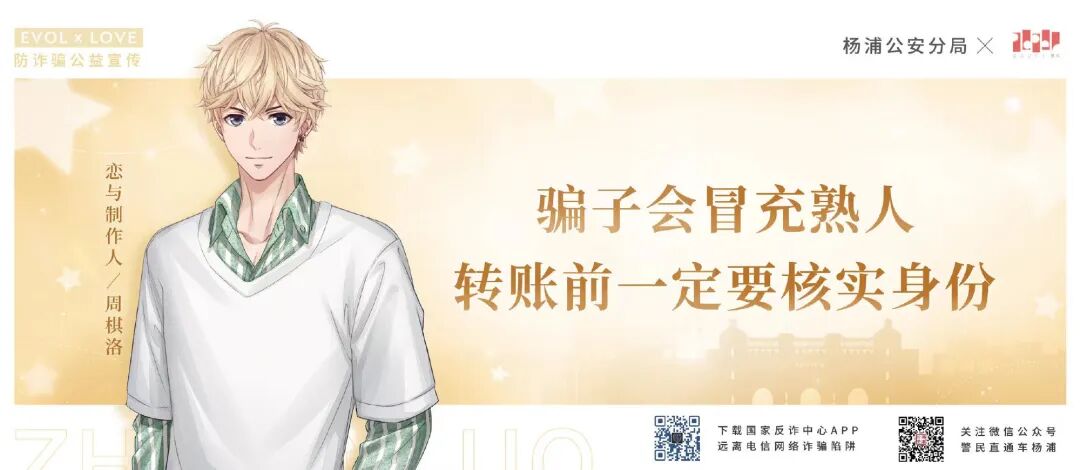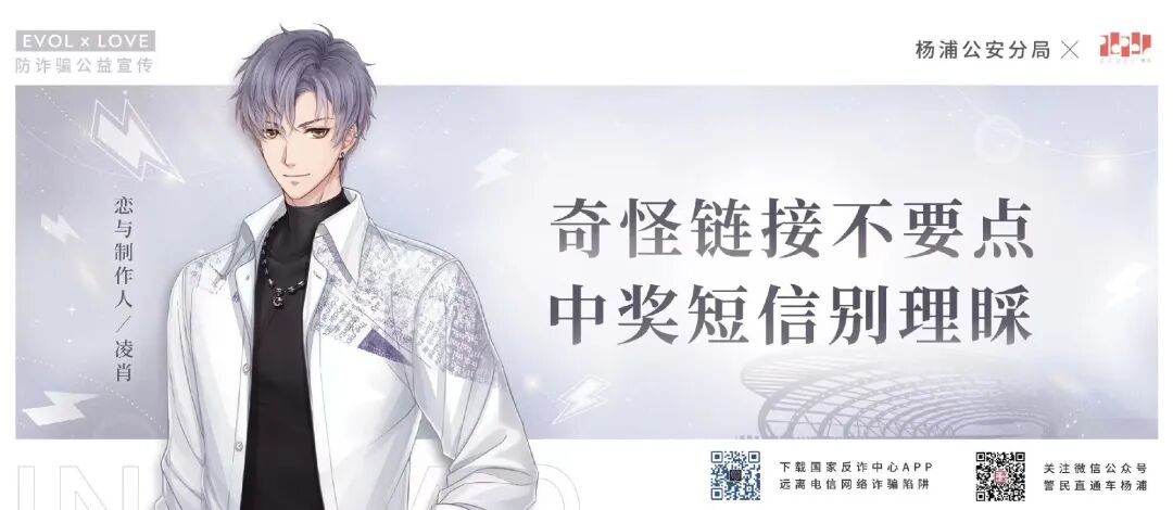 果然,在宣传这块,没有人比警察蜀黍的官方,更到位、更细致、更全面的了,简直是广告学必备的绝佳案例!除了做可爱的周边外,在宣传反诈的方面,警察蜀黍也是无所不及、无微不至、无懈可击。就比如这个,杨浦公安分局和恋与制作人合作制作的反诈宣传。一方面通过纸片人来吸引注意力,另一方面辐射到恋与制作人的用户,精准铺到每一个公交车站,让每一位等车的友友都能看到,以尽大可能为用户打防电信诈骗预防针——
