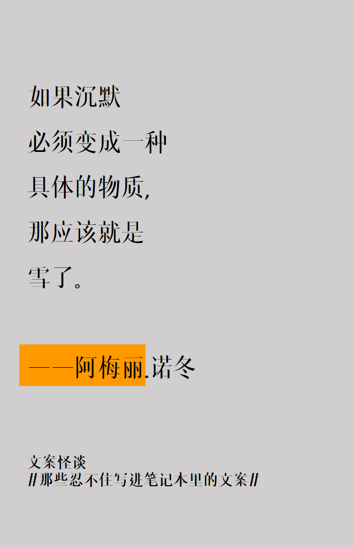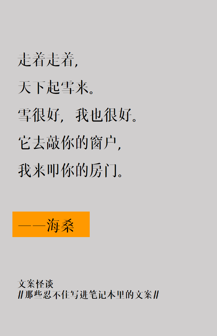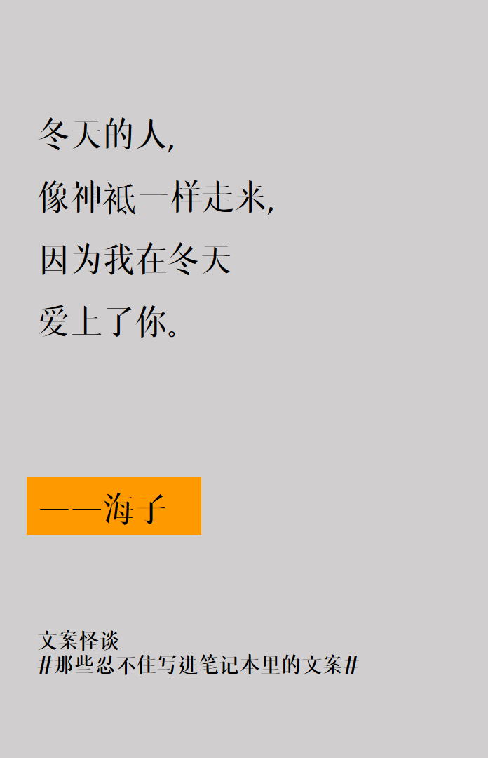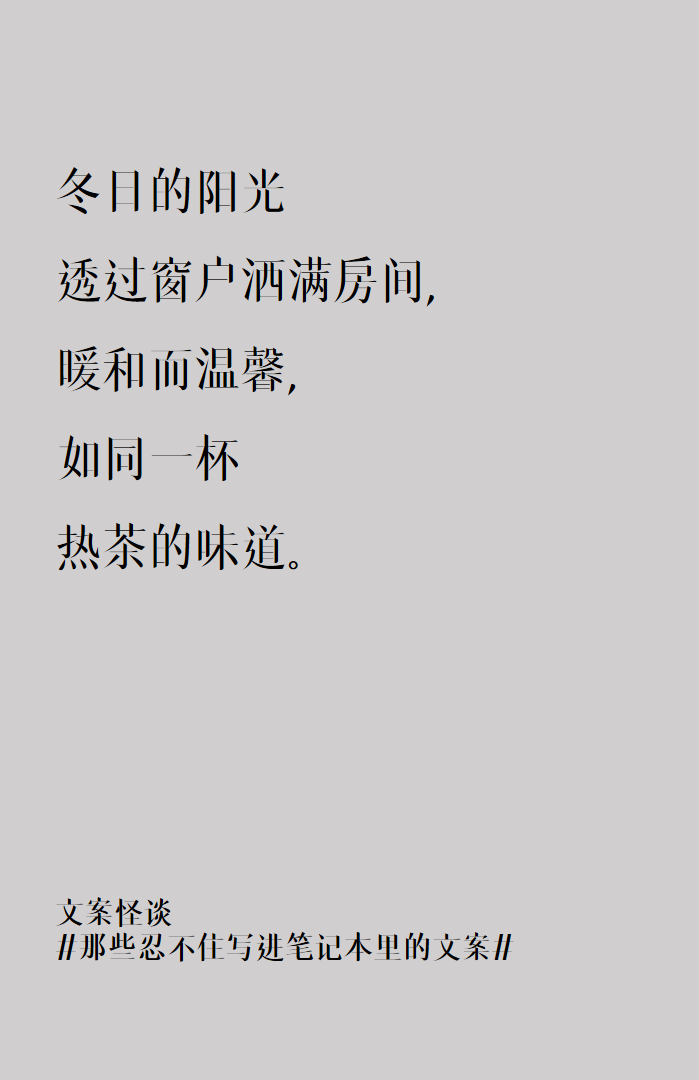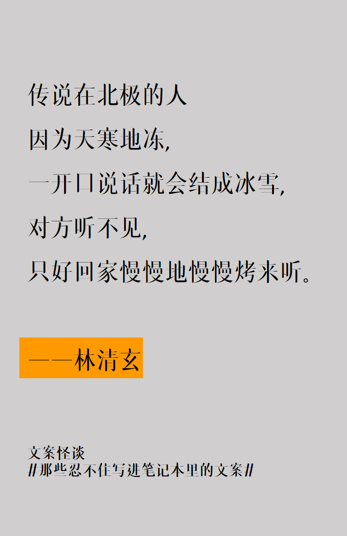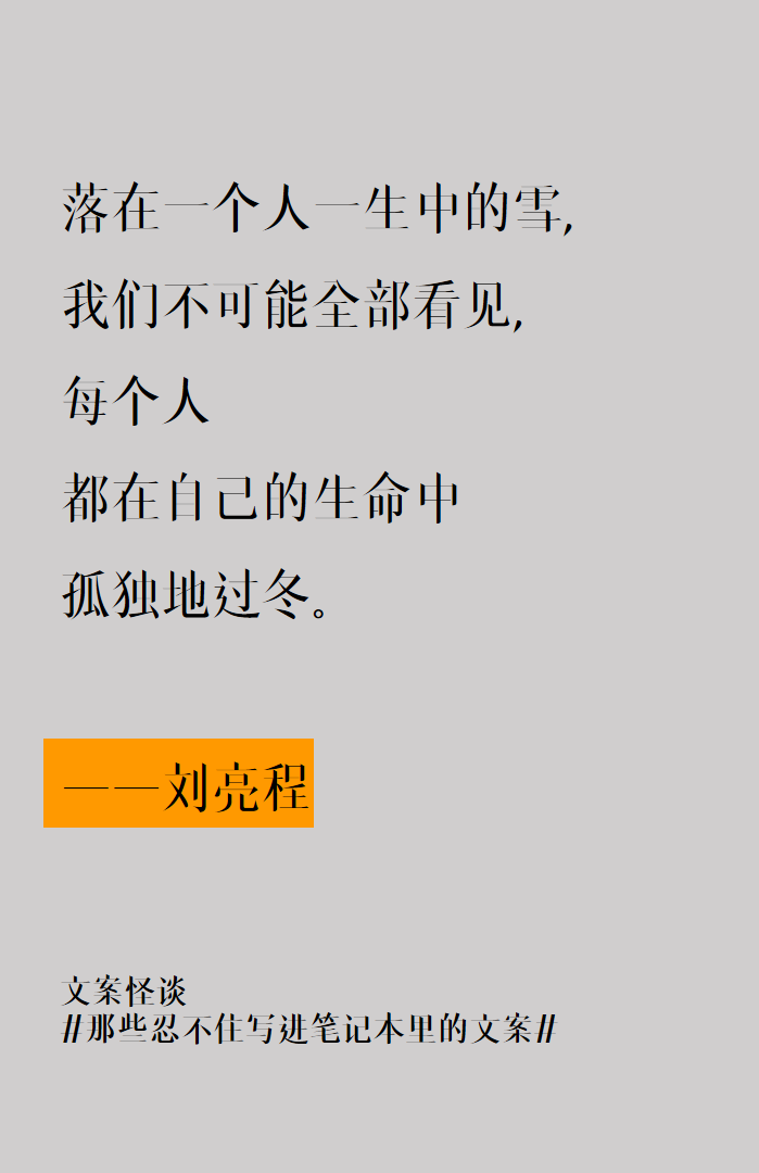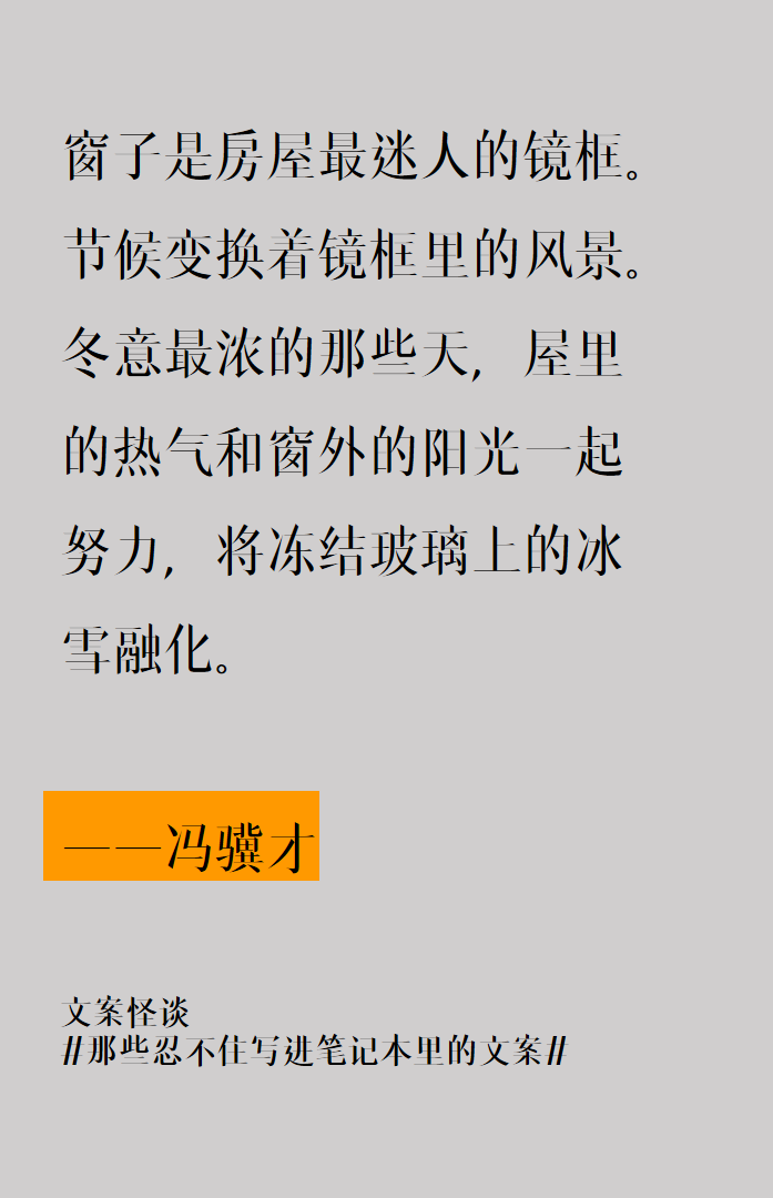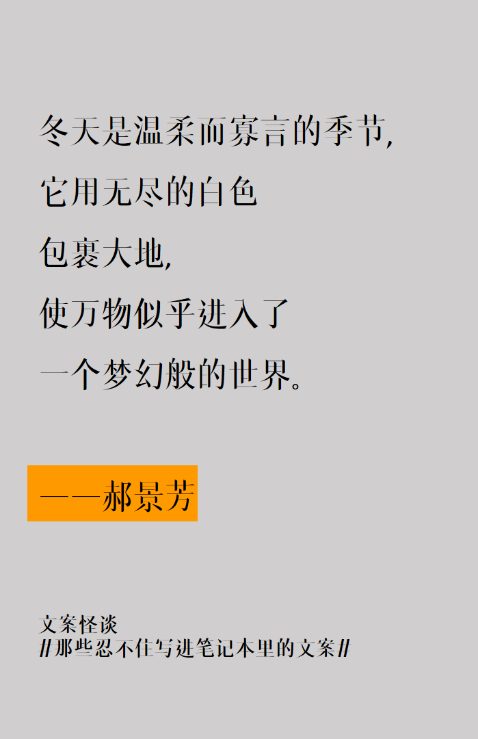 因为市面上的广告文案,都是经过别人消化、咀嚼过的成果。这些文案可以看,但我们也需要其他内容养分的滋养,来给我们提供更多的洞察角度、表达方式、观点形态等等。最近天气太冷了,季节变换的时刻,人总要学会抵御寒冷。我想,看一些作家笔下的冬天文案,也是抵御寒冷的一种方式吧。