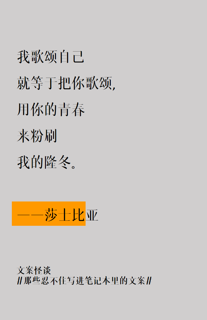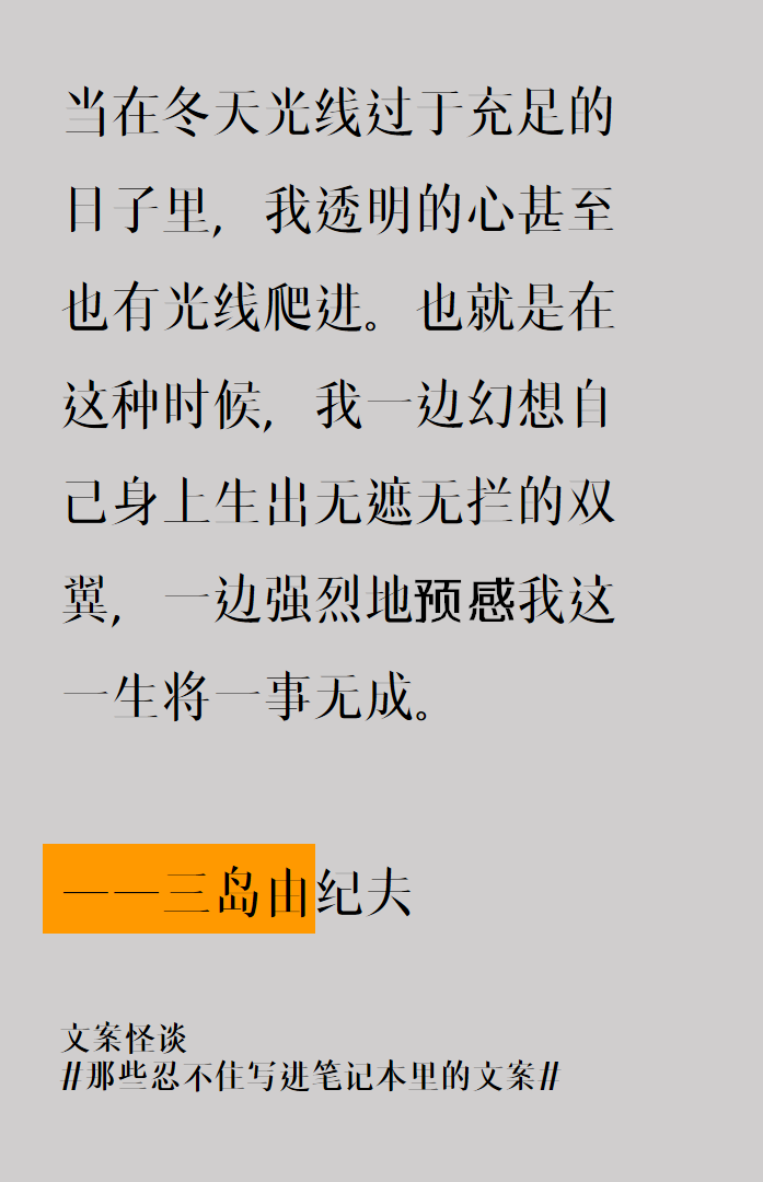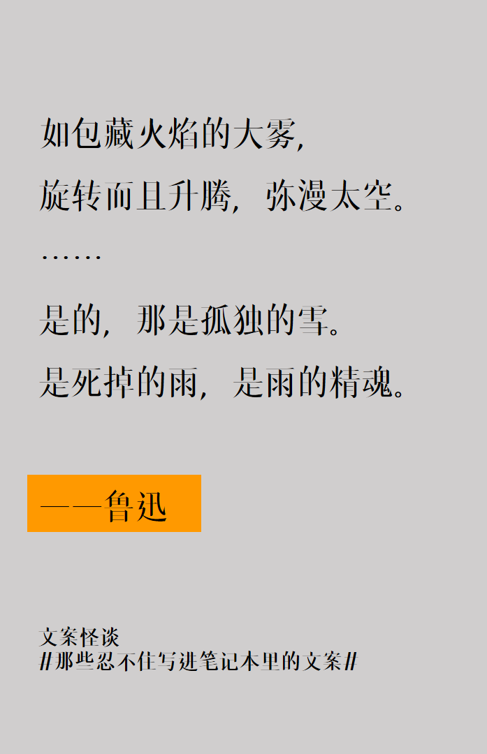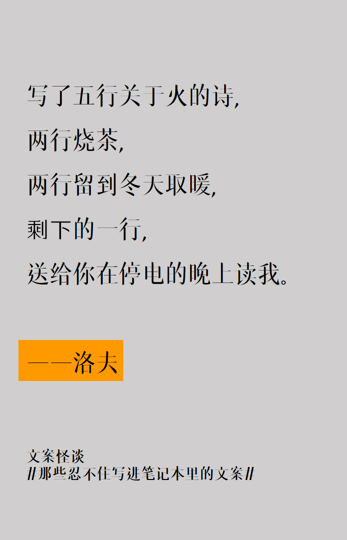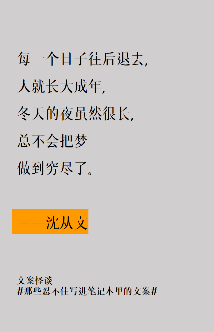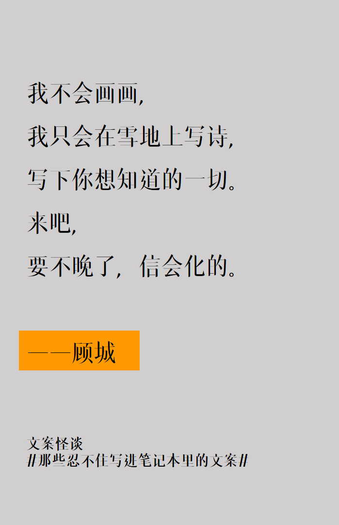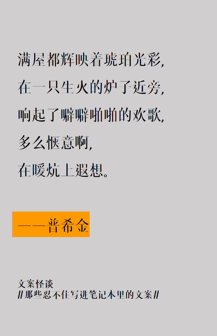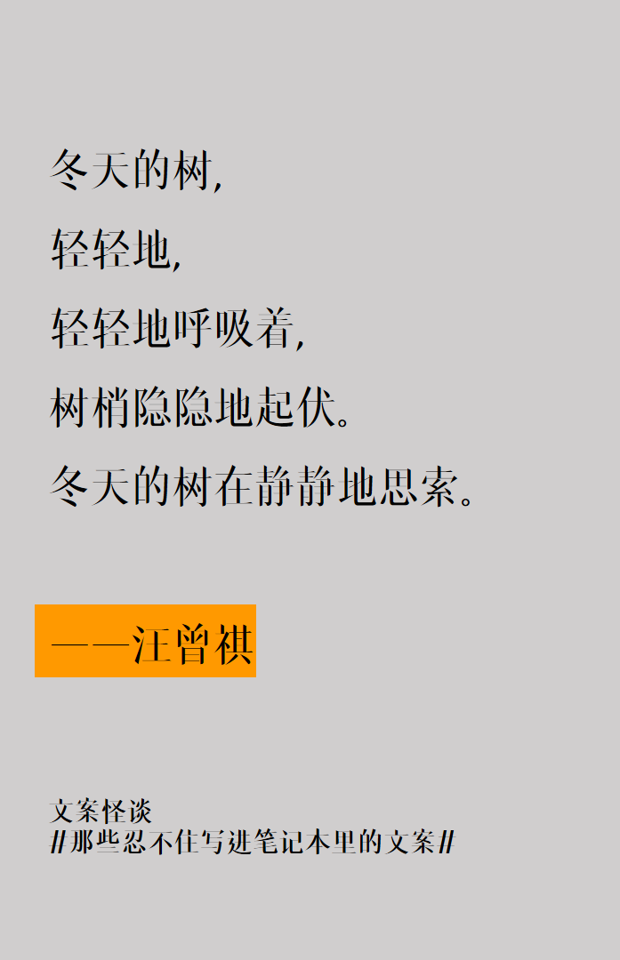 因为市面上的广告文案,都是经过别人消化、咀嚼过的成果。这些文案可以看,但我们也需要其他内容养分的滋养,来给我们提供更多的洞察角度、表达方式、观点形态等等。最近天气太冷了,季节变换的时刻,人总要学会抵御寒冷。我想,看一些作家笔下的冬天文案,也是抵御寒冷的一种方式吧。