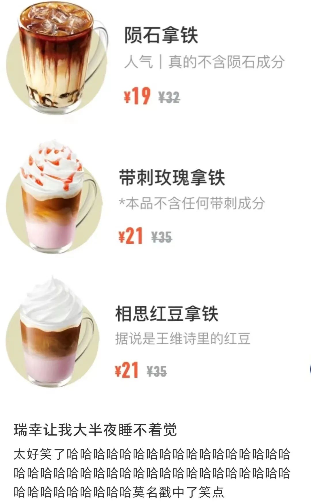 为了给产品取一个让人眼前一亮的名字,瑞幸煞费苦心。可取完名字,又要去规避风险。于是,我们就在瑞幸的点单小程序上看到了陨石拿铁(真的不含陨石成分)、带刺玫瑰拿铁(本品不含任何带刺成分)、相思红豆拿铁(据说是王维诗里的红豆)等带点幽默的文案提示。