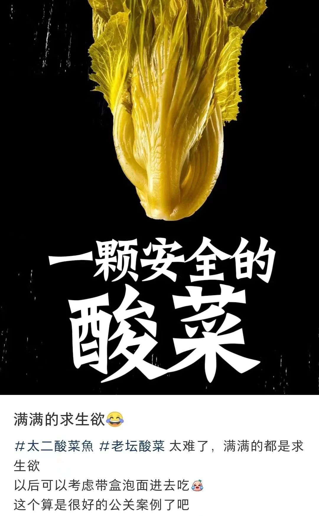 当然,正如库迪能把潜在的宣传风险转化为出圈的爆点,品牌的求生欲往往在遭遇舆情风波时发挥到极致,是品牌危机公关的一大武器。比如2022年3.15曝光土坑酸菜问题后,一大批与酸菜有关的企业陷入了至暗时刻。太二酸菜鱼则积极应对,晒出了一份“太二酸菜安全报告”,极具视觉冲击力的配图和有趣的文案,着实打消了大众的顾虑,为品牌赢得了不少正面评价。