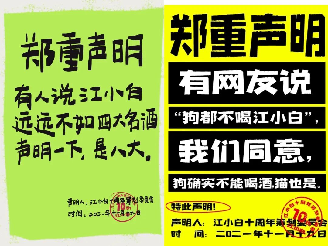 更绝的是江小白,2021年品牌成立十周年时,连发了100张文案海报,不少都是对网友“恶评”的回击:“有人说江小白远远不如四大名酒,声明一下,是八大。”“有网友说‘狗都不喝江小白’,我们同意,狗确实不能喝酒,猫也是。”“对于‘懂酒的只喝酱香型,不懂的才选江小白这种流量型’的说法,我们想做有流量的清香型。”如此真诚又有梗的回应,试问谁看了不迷糊不被圈粉呢?