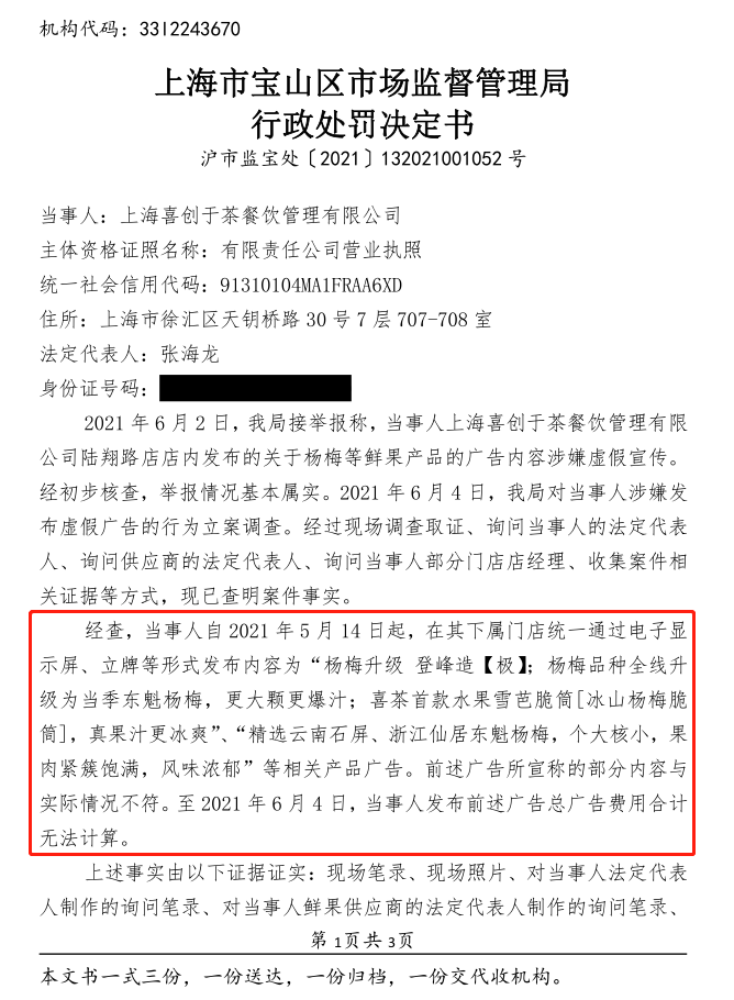 那么,如果在宣传时满嘴跑火车,对真实性不管不顾,会有什么后果呢?2021年,喜茶因发布的“精选云南石屏、浙江仙居东魁杨梅,个大核小,果肉紧簇饱满,风味浓郁”等广告内容与事实不符,涉嫌虚假宣传,被罚款45万;