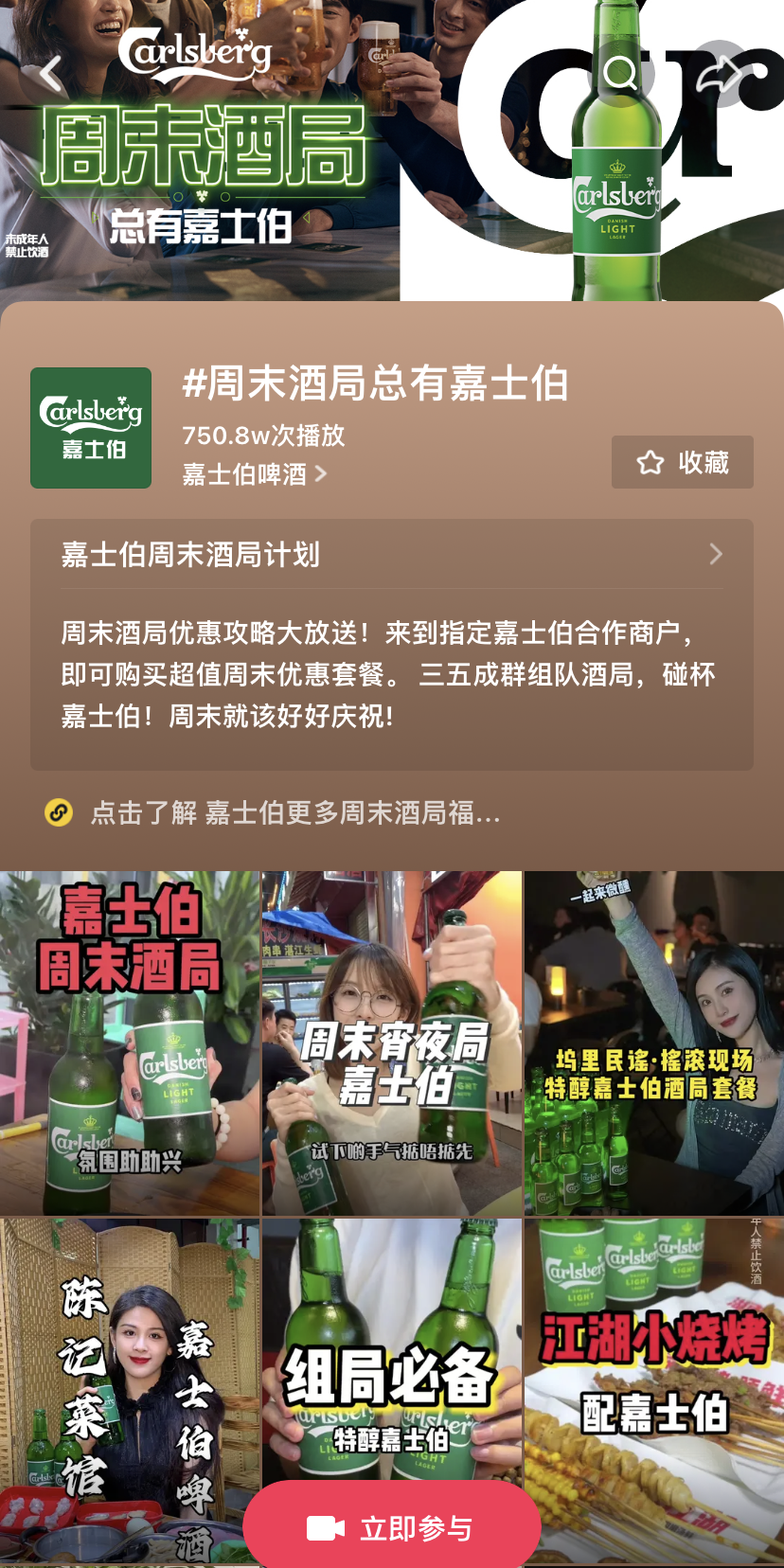 每逢周末来临,上抖音搜索“周末聚餐好去处”成为不少用户的习惯。嘉士伯啤酒与抖音生活服务发起的「周末酒局计划」,便选择首先切入用户“种草局”,在用户为周末聚餐搜索攻略的路径中,埋入话题内容,从而引导用户自发参与。截至目前,活动相关话题播放量超750万次。那么嘉士伯啤酒是如何成功调动用户参与兴趣,并建立了“周末酒局总有嘉士伯”的场景化联想?
