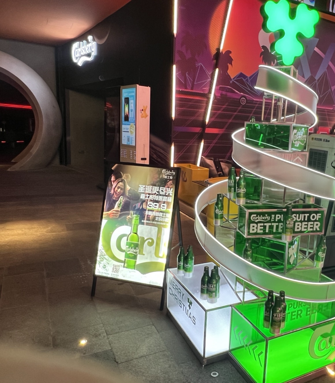 另一方面,是为用户打造沉浸式的聚会氛围。当用户相约来到店里,会发现店铺装扮“焕然一新”。有别于日常,店铺内处处铺陈上了嘉士伯啤酒的相关内容,刚进门时的嘉士伯啤酒堆箱与套餐海报,瞬间拉满聚会的场景氛围感。当大家共同举杯一起欢度周末时,墙上的#周末酒局总有嘉士伯 品牌标语,恰到好处烘托着氛围走向高潮。在全方位、沉浸式的门店体验中,有效提升用户对品牌的感知,同时实现强有力的消费印记,加强嘉士伯啤酒与周末聚餐场景的绑定,在潜移默化间培养起用户的日常消费习惯。