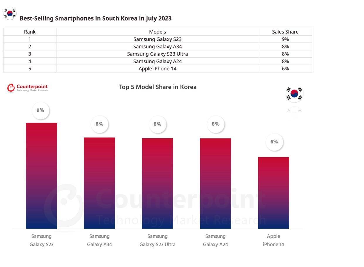 以韩国2023年7月手机畅销榜TOP5为例,除了排名第五的iPhone14,其他四款都是三星手机,三星A34销量占比8%,三星A24,销量也达到了8%。事实上,三星冠绝全球那么多年,所依靠的一直是中低端产品。