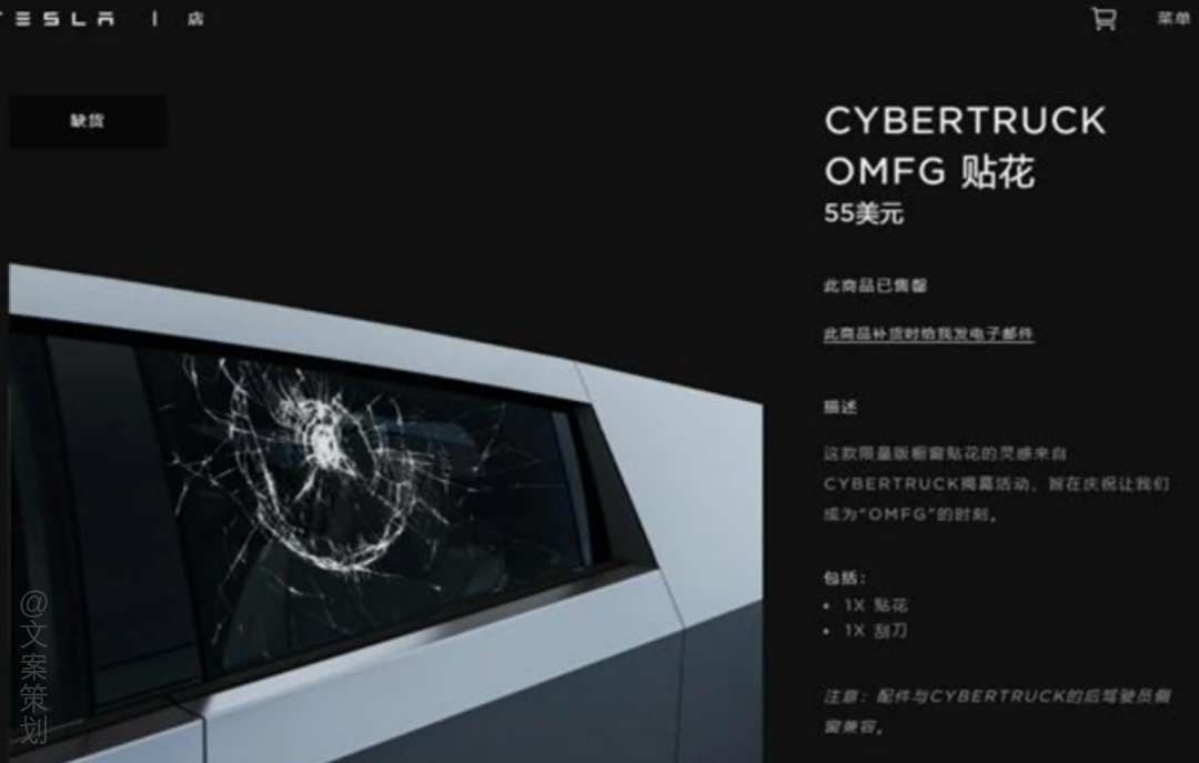 这可是一场不小的翻车事件,意想不到的却是,特斯拉推出了”铁球砸窗“贴花与短袖,并标注设计来源自cybertruck发布会。