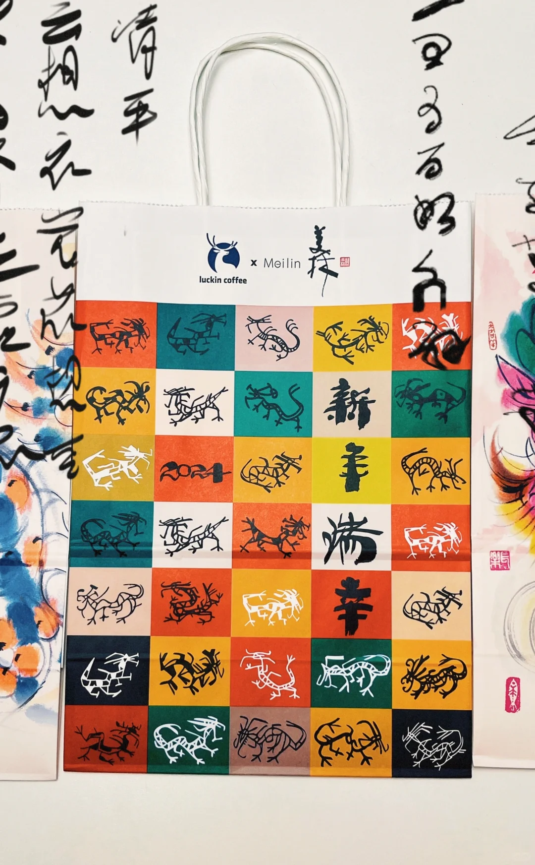 一个是在许多彩色格子中,嵌入“2024 新年瑞幸”字样和各种形态有点甲骨文感觉的“线条龙”。