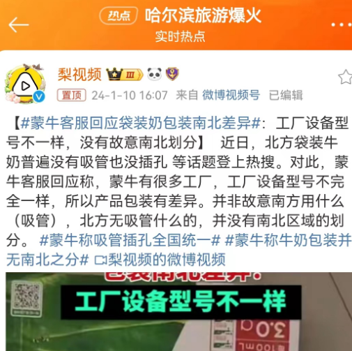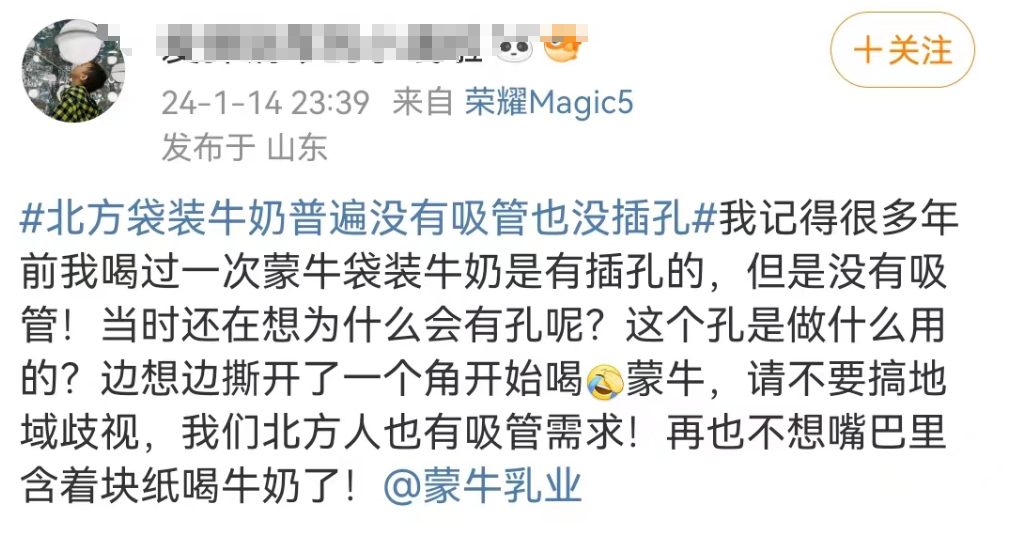 牛奶品牌的这一出出公关,虽然也没有效回应“北方没吸管”这个真实存在的现象,但也算是躲过翻车。因为喝牛奶配吸管这事,是关乎甜咸豆花、甜咸粽子、饺子汤圆的地域差异化的问题,涉及圈层广泛,且具有热知识变冷知识的反差感,自带社会关注度与话题讨论度,所以也给网友贡献了很多谈资。