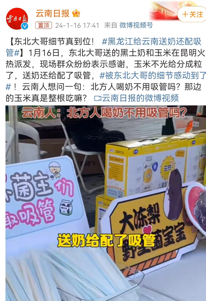 伊利则提到,袋装奶都没设计插孔和吸管,南北都一个样。还有飞鹤牛奶也整活儿了,给云南送奶还配上吸管,上演“东北大哥”送吸管铁汉柔情的场面。