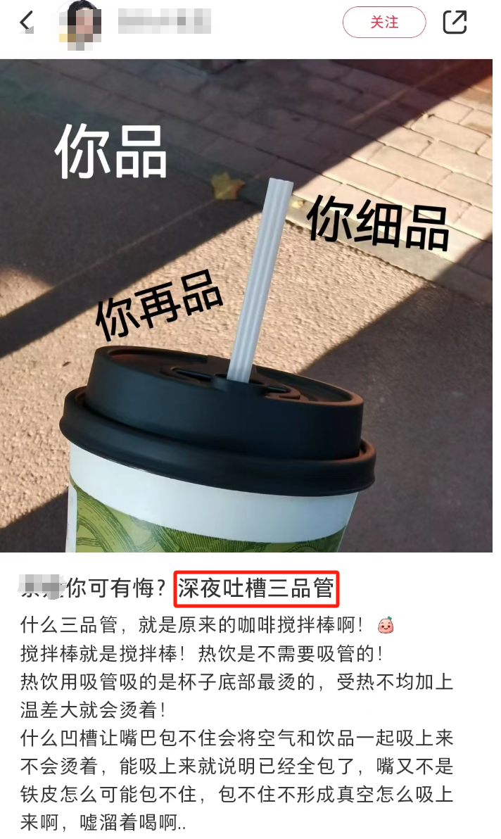 但体验下降也是实实在在的,正如一个强迫症患者喝麦当劳可乐真实体验:喝的时候老感觉嘴不够大,杯里的冰块总是一起滑溜到嘴里,饮料要从嘴边洒出来。还有霸王茶姬、古茗等奶茶品牌都推出了三品管——又扁又细又有3个孔的吸管。虽然有品牌美其名为“一品茶香二品茶味三品茶韵”,但逃不过被嘲“歹毒的设计”。