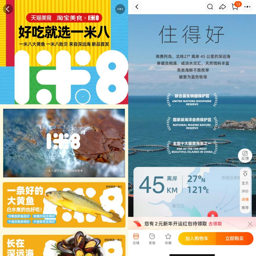 根据天猫店铺的介绍,来自舟山嵊泗列岛的鲜活贻贝、温州南麂列岛的生冻大黄鱼是一米八品牌的起点,它希望给消费者提供基因好、住得好、养得好、买得好的优质海水蛋白产品,并探索全产业链品牌化、标准化、工业化、智能化,推荐渔业产业创新和可持续绿色发展。