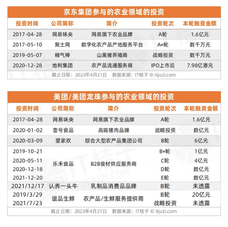 此外,美团、京东、抖音、快手、腾讯都在以投资、项目活动的方式参与到农业改造中来。举个例子,京东投资了聚土网、地利集团,美团投资了乐禾食品、认养一头牛,抖音集团发起了“山货上头条”项目活动,在抖音电商上售卖各地的农产品。