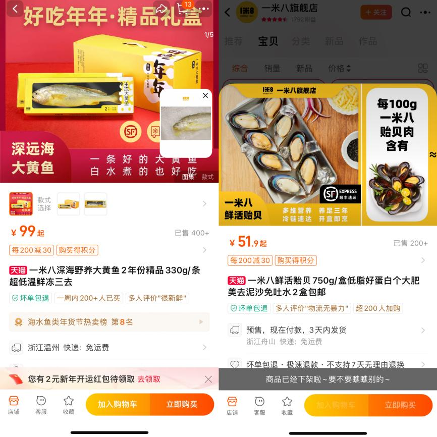 天猫店铺并非是一米八的产品首发地,去年12月,一米八在盒马首发新品,包括鲜活贻贝和生冻大黄鱼。不过,目前一米八贻贝在盒马App、天猫店铺都已下架。