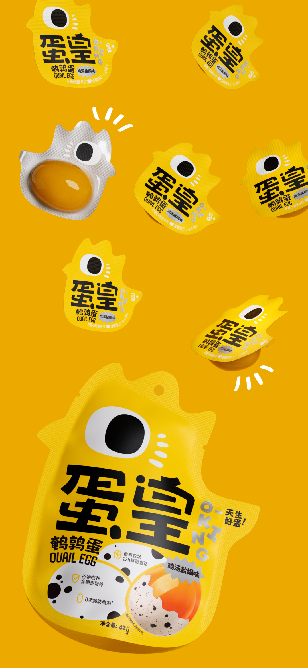 新年新气象,新的包装设计总能给我们新的期待。最近,潘虎设计实验室为盐津铺子蛋皇鹌鹑蛋零食设计了一款新包装。