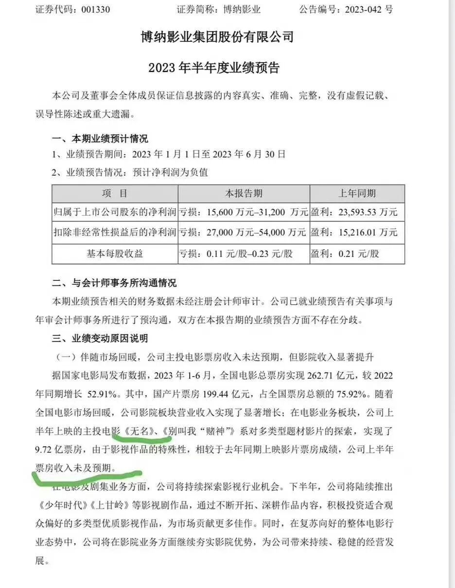 或是被曝电影收益没有达到预期。《无名》的票房为9.31亿元,虽然不低,但根据博纳影业发布的业绩报告显示,净利润却是是负值:“相交于去年同期上映的票房成绩,票房收入未及预期。”