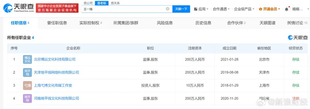 目前,王一博名下关联的4家企业中有3家为存续状态,分别是北京博远文化科技有限公司、天津地平线网络科技有限公司和上海弋博文化传媒工作室,这3家企业也均和乐华娱乐无直接股权关联。