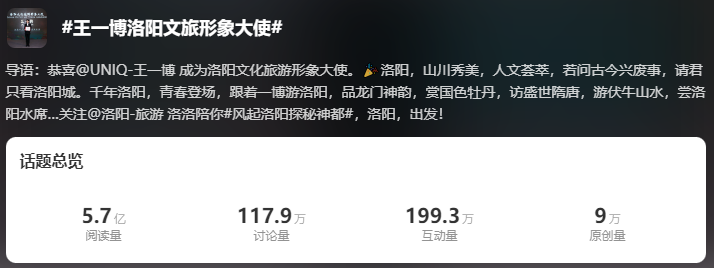 不仅#王一博洛阳文旅形象大使#的话题有高达5.7亿的阅读量,洛阳也成为了今年春节旅游预定增长率全国第一的城市,社交平台上有很多人选择跟随偶像的脚步去晒照打卡。
