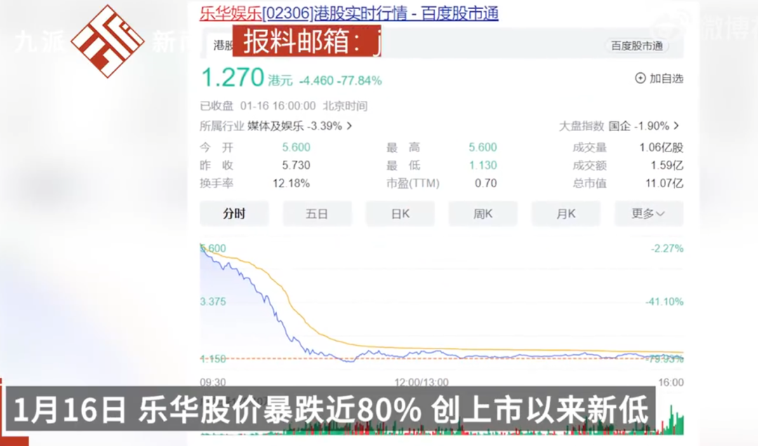 据媒体报道,1月16日乐华娱乐(02306.HK)股价异动,至收盘暴跌近80%,一日之间间市值蒸发38.89亿港元,创历史新低!