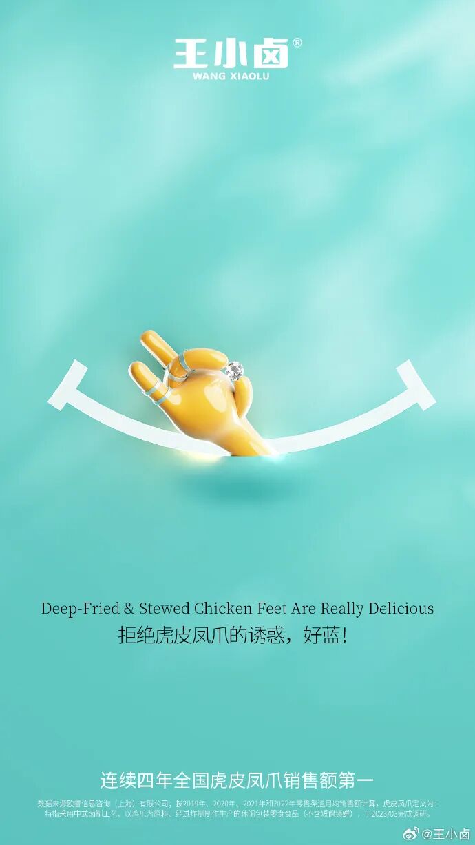这还没完,紧接着又冷不防地插入一段王家卫执导电影《阿飞正传》里的台词典故,"这个世界有种鸟是没有脚的,它只可以一直飞啊飞……”为什么没有脚呢?因为都被王小卤用来做卤味了。看了王小卤的系列搞笑广告,我只觉得,一本正经地胡说八道也是一门学问。