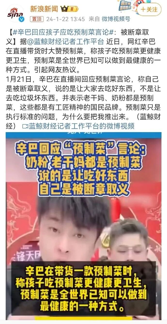 这几天网红辛巴在直播中力挺预制菜,并且声称给孩子吃预制菜更健康,更卫生。