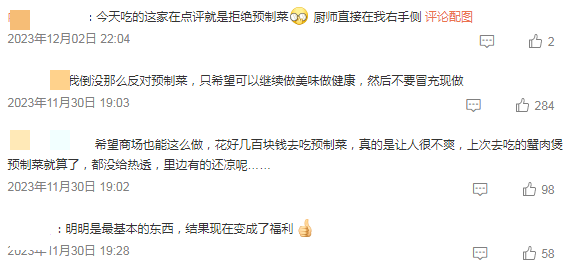 渐渐的消费者就不买预制菜的帐了,网络上也逐渐出现不少“抵制预制菜”,“餐厅使用预制菜究竟要不要提前告知”的各种言论。