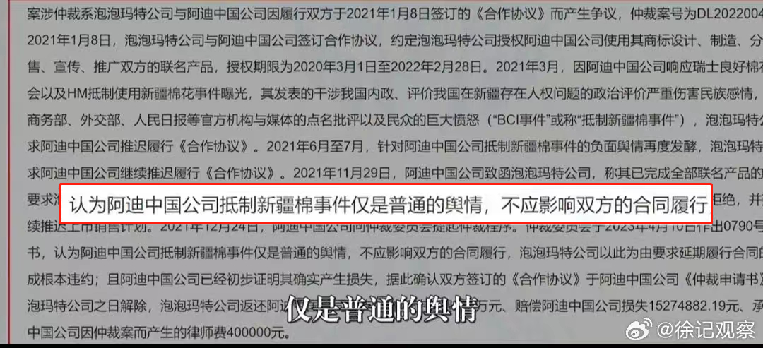 没想到阿迪达斯的冲裁理由是“抵制新疆棉事件仅是普通的舆情,不应影响双方合同履行”。这是赤裸裸地把对中国赤裸裸的抹黑,想大事化小小事化无了。