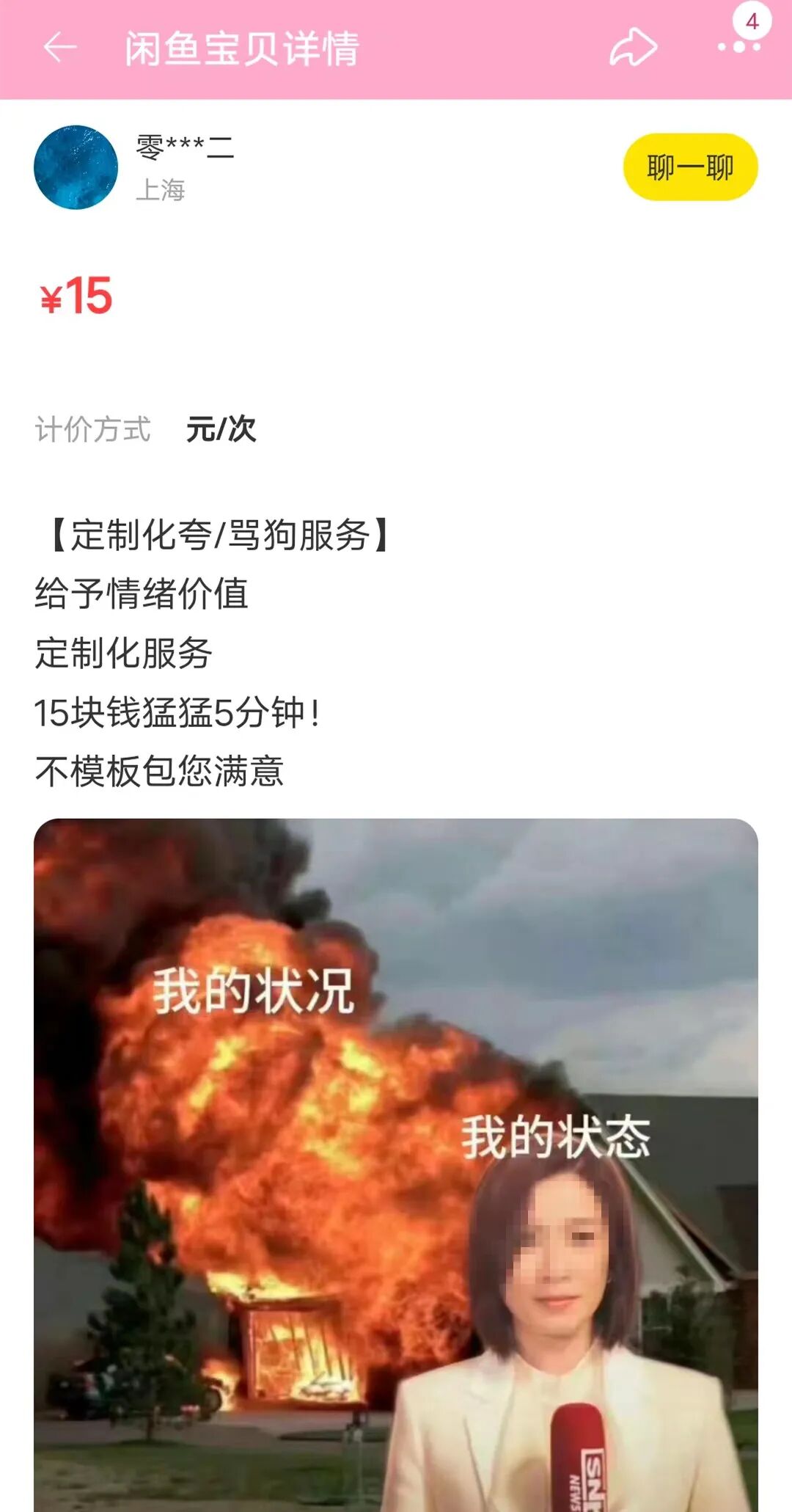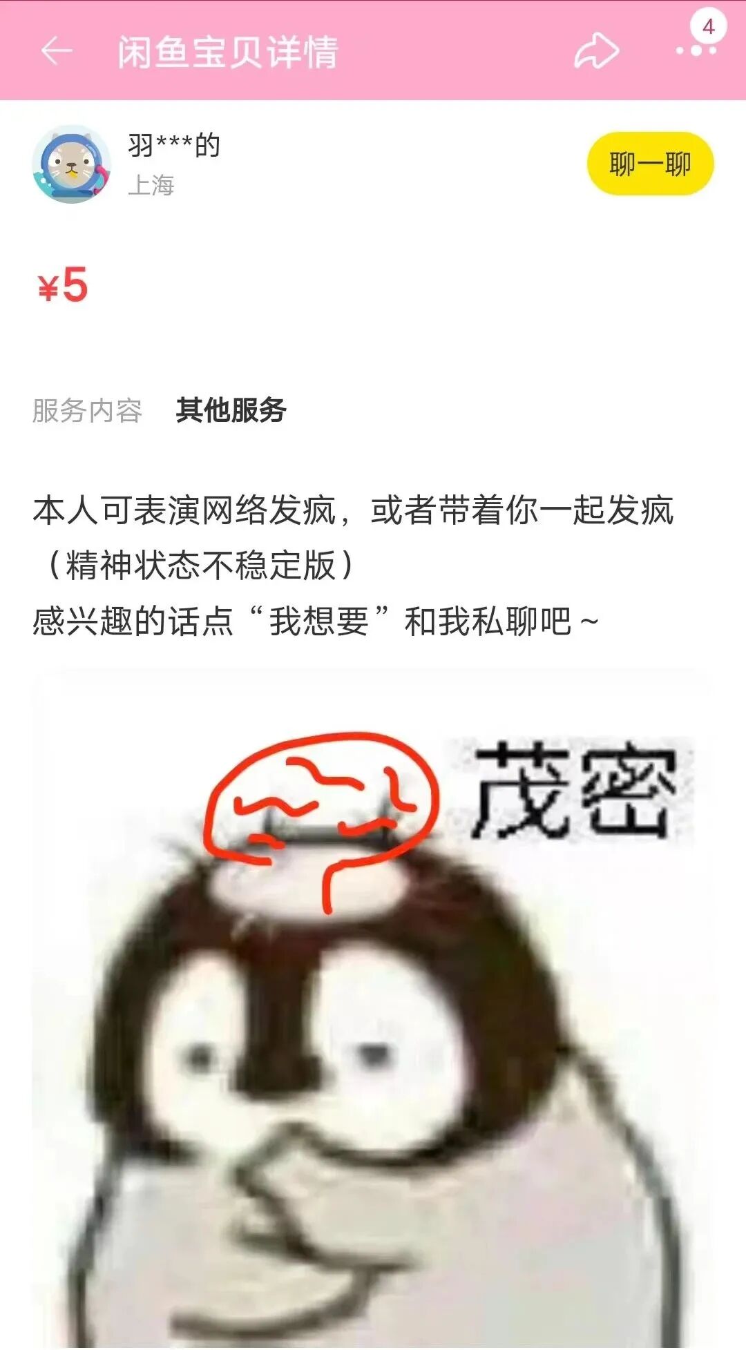 想要发疯,一个人又没有勇气怎么办?可以寻找“发疯服务”,只需要5块钱,就能给你当场表演发疯,或者带着你一起疯。