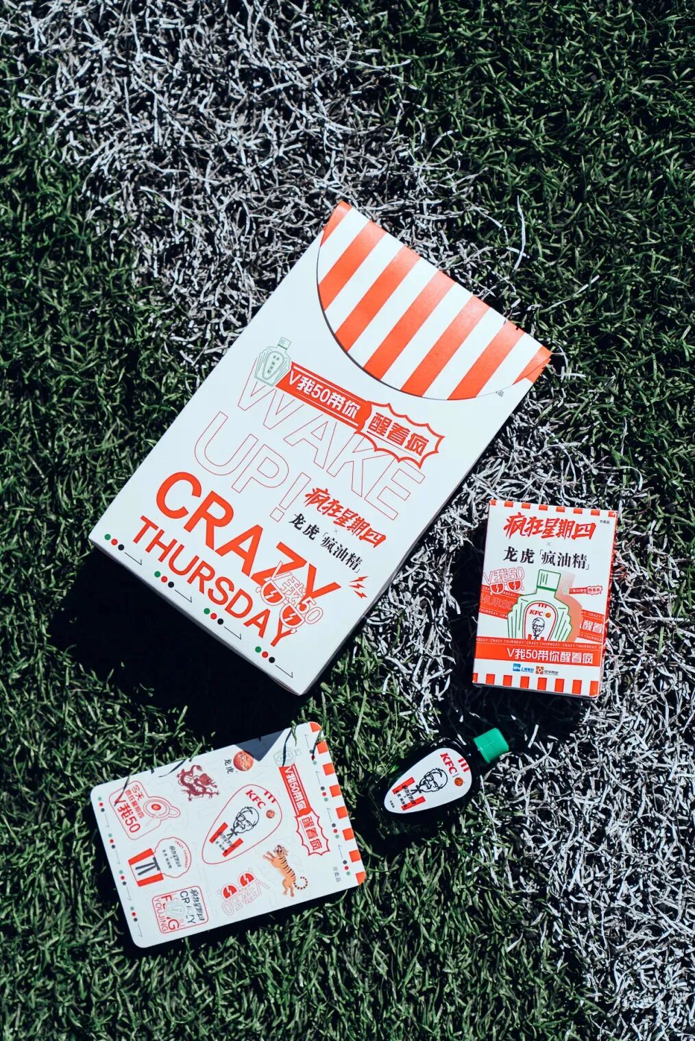 看着官方送出的“龙虎疯油精”、精油贴及联名包装袋,我陷入了沉思,难怪肯德基要叫要把星期四加个疯狂的前缀,好家伙,这是真疯啊~