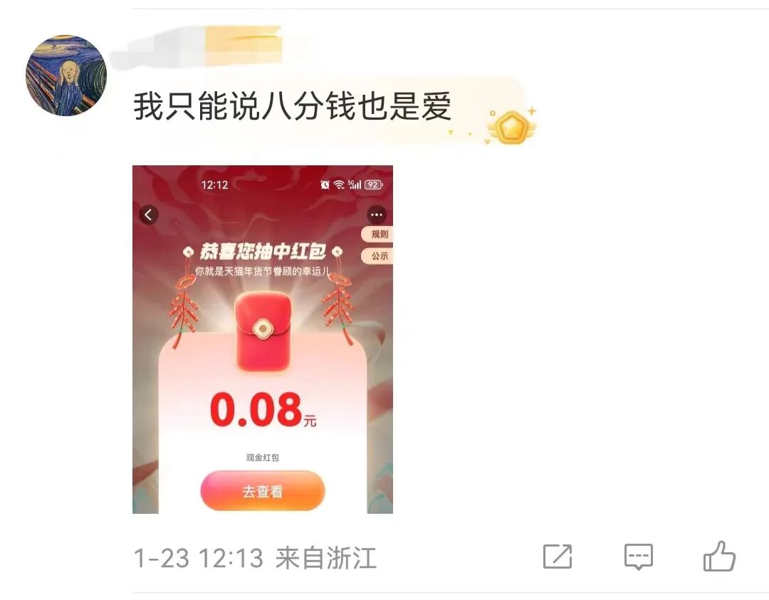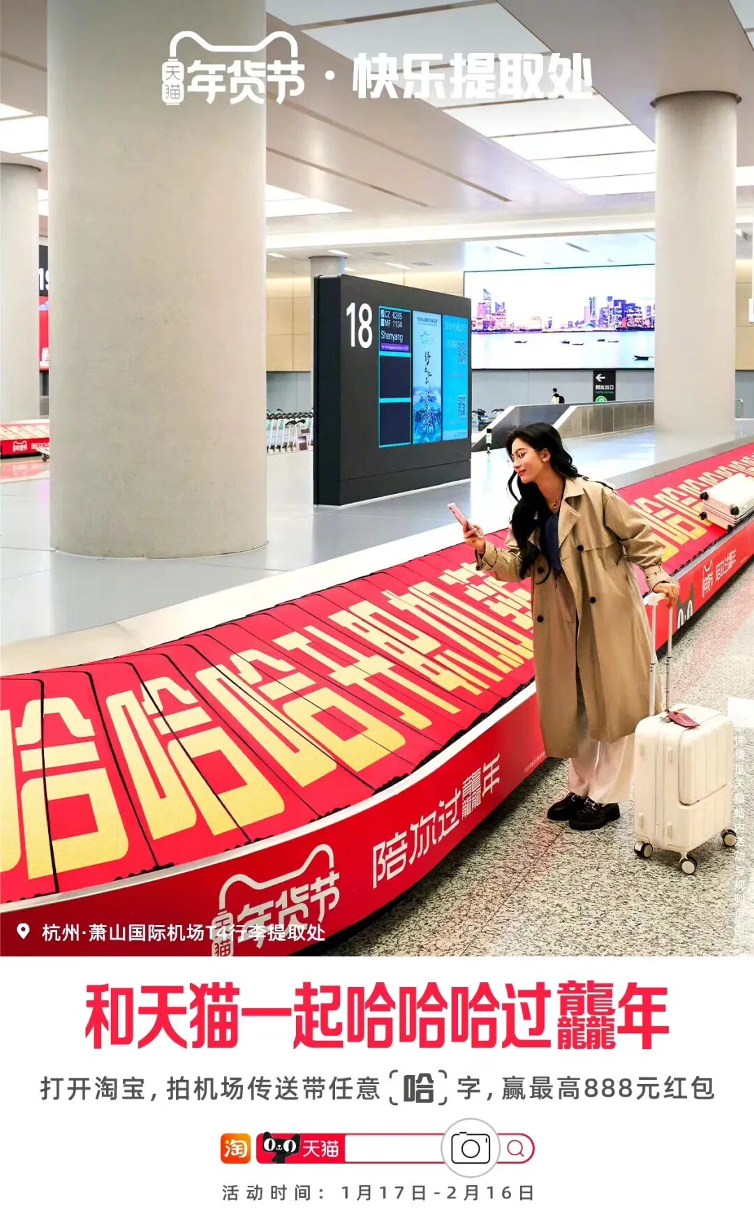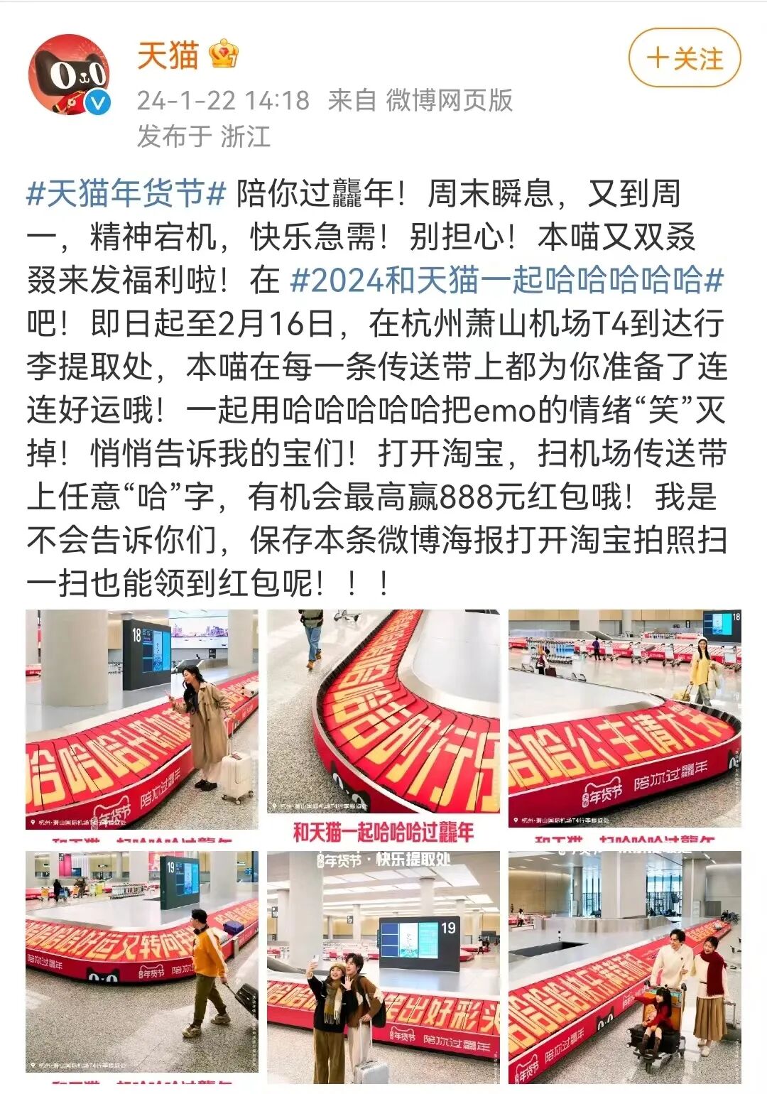 天猫这次选择把新年户外互动装置布局在机场内,然后将一句句轻松又带有一种美好寓意的话语放在行李传送带上展现,也就相当于在这个旅客注意力高度集中的地方,往人们心坎上吹拂了一阵惬意的清风,制造出了一点意外的惊喜。再加上临近春节又置身于机场场景里,旅客们天然就会对“新年、快乐”这类的字眼产生双关联想,无形中将品牌与新春场景绑定。每一位旅客在等待行李到达的间隙,就像是在等待一份快乐的抵达,也传递着天猫对大家的新年祝福。网友们在品牌的官方微博评论区也展开了积极的互动,扫海报上的任意“哈”字也能收获惊喜红包的玩法,让一大批没能去到互动装置现场的网友也可以灵活地参与进来,从而带动受众的自发传播。可以感知到,天猫的这波户外广告不仅仅是在传递品牌信息,它更是成为与消费者之间进行内容沟通与互动的一部分。品牌想要借势传统佳节所传递的活动理念也非常简单,笑就完事儿了,快乐就完事儿了。