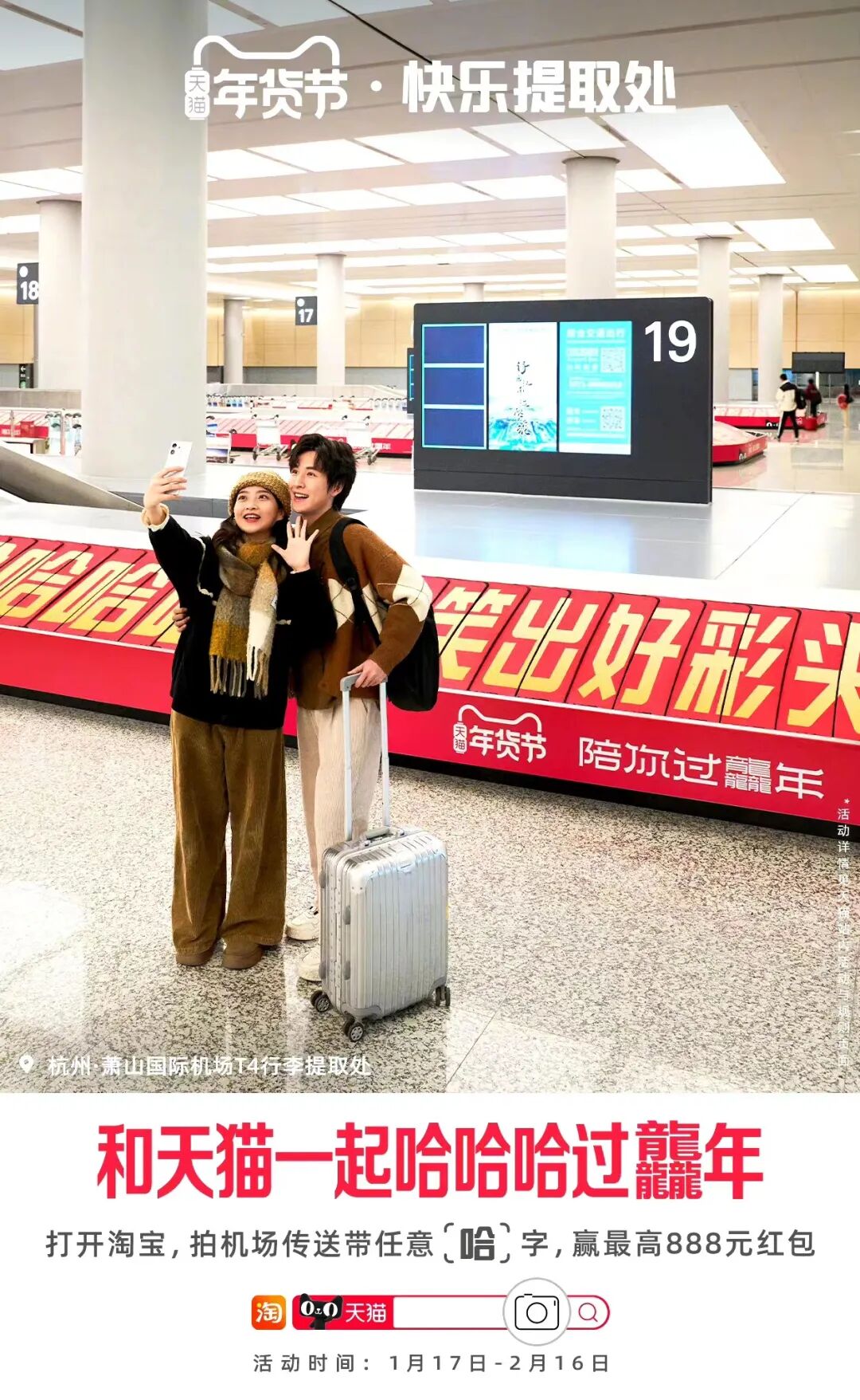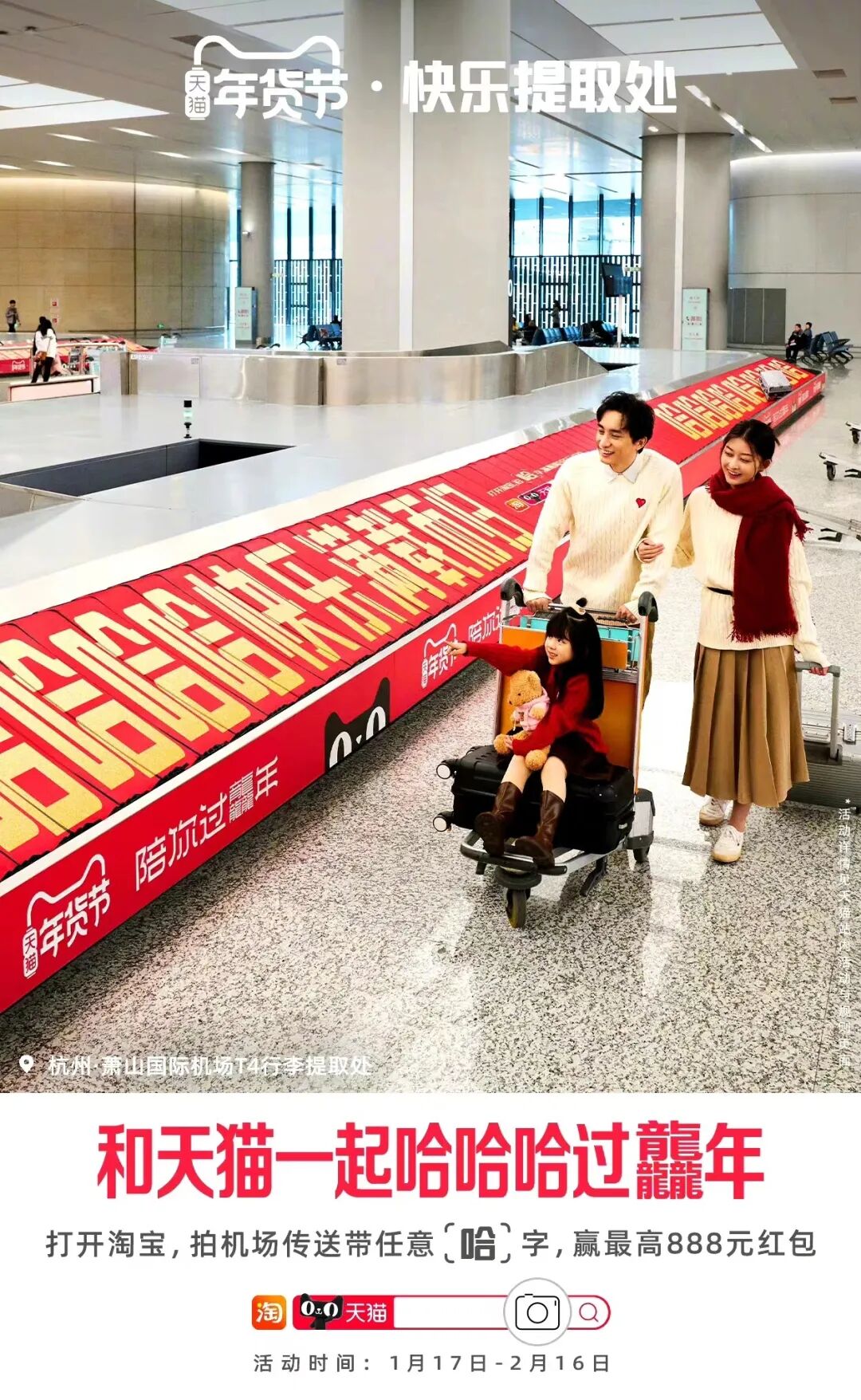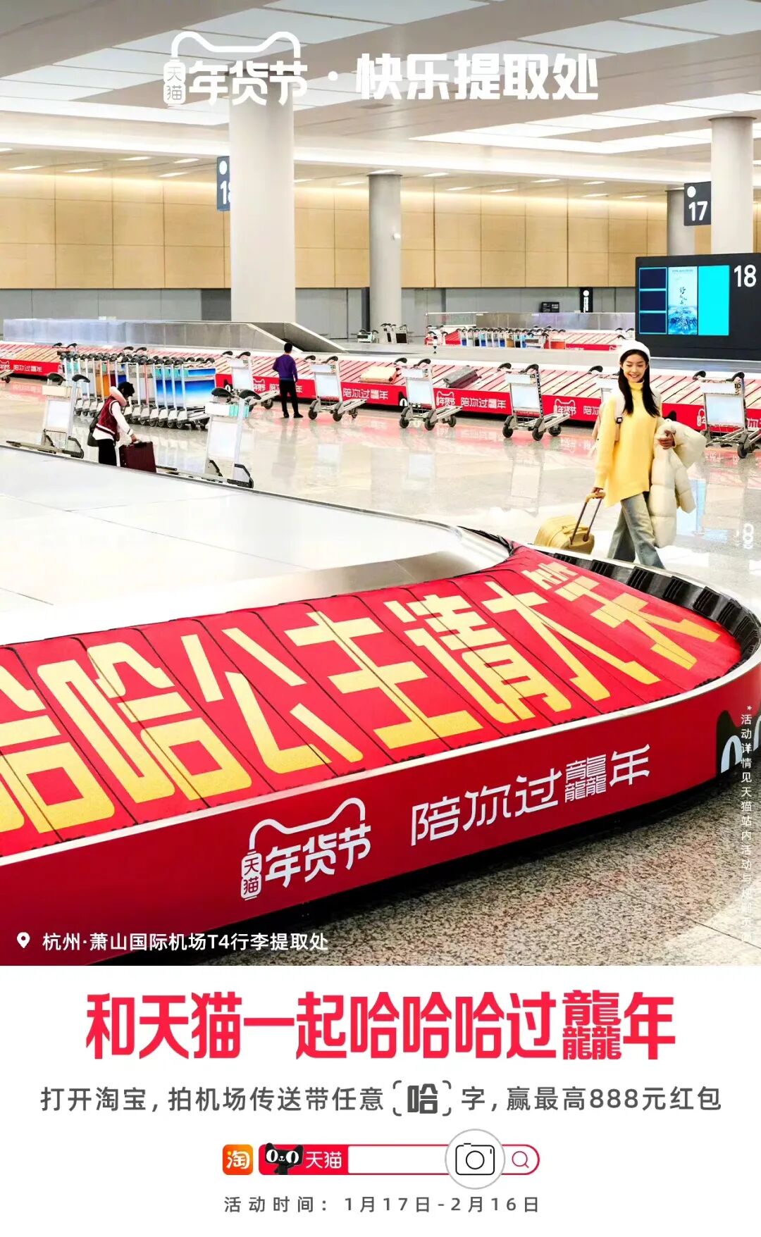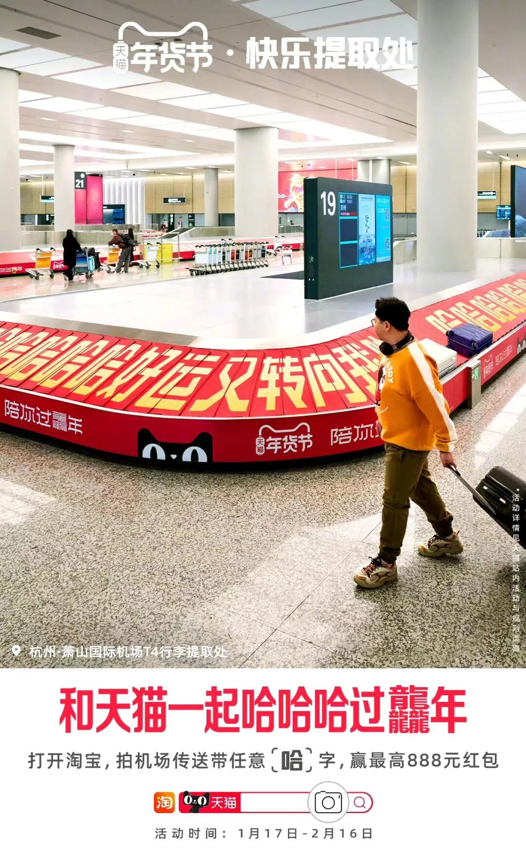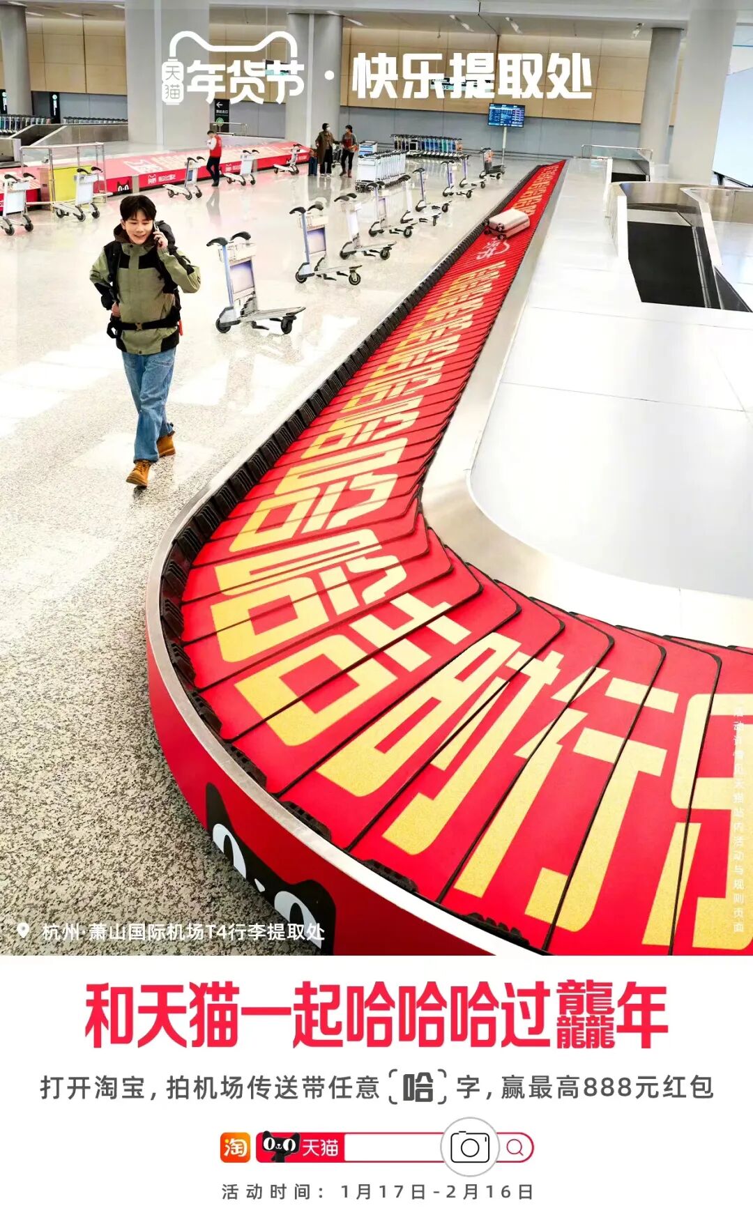 那么在这个5-10分钟的心理空窗期,如何才能有效攫取行人的注意力呢?天猫就借势即将到来的龙年春节,在杭州萧山机场打造了一个魔性又有趣的「快乐提取处」。